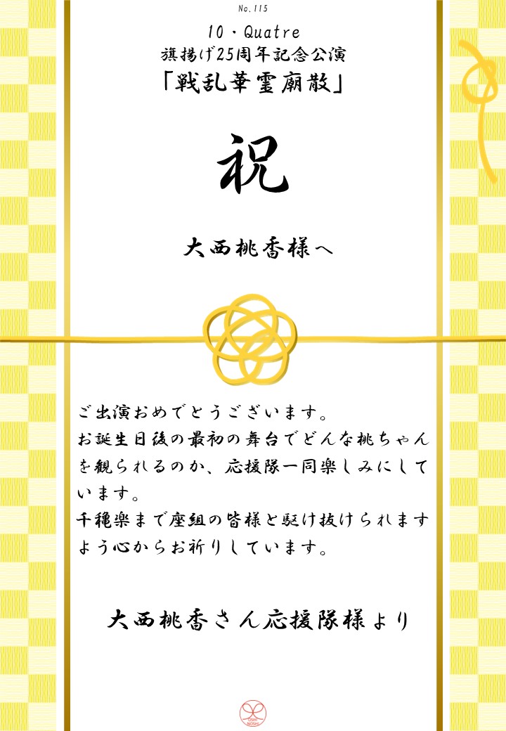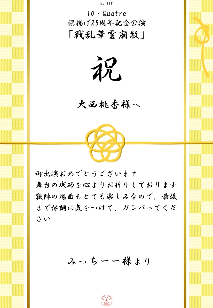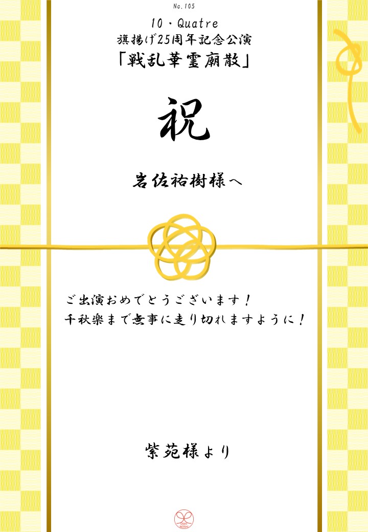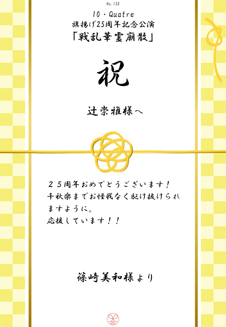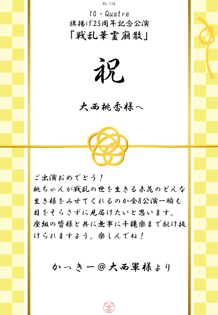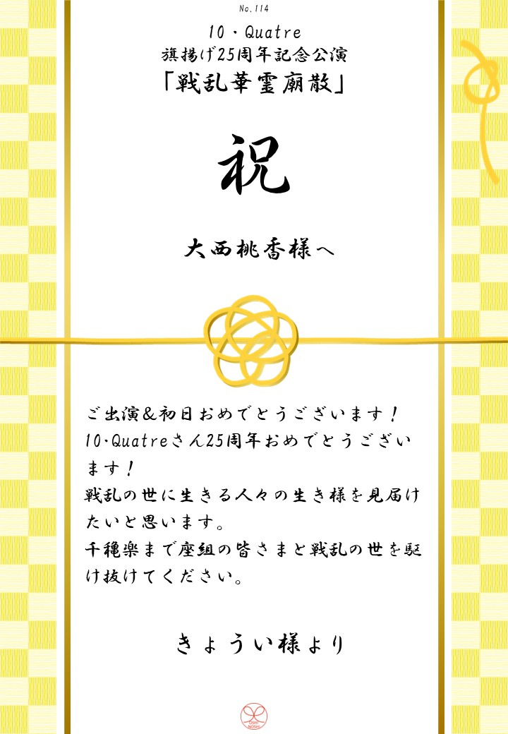 10・Quatre 旗揚げ25周年記念公演「戦乱華霊廟散」おしのしギャラリー 投稿日 2025年8月3日 更新日 2025年9月30日 著者 OSHINOSHI ギャラリーカテゴリ 公演応援のしギャラリー 10・Quatre 旗揚げ25周年記念公演「戦乱華霊廟散」の応援のし&差入れのしを掲示します。 応援のし募集中です。