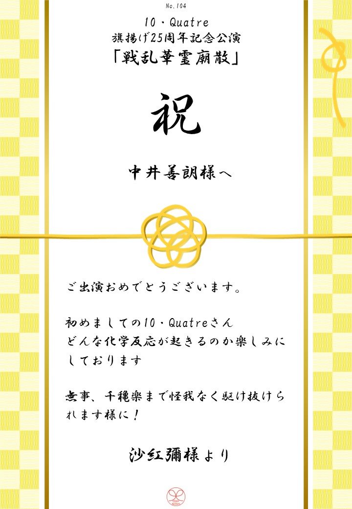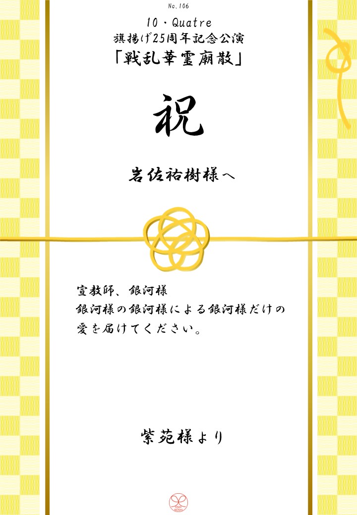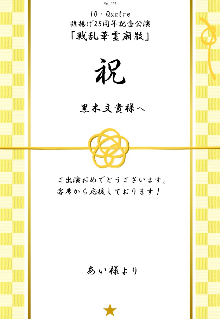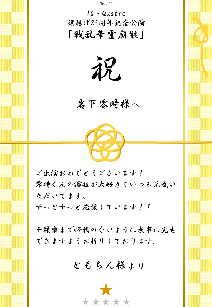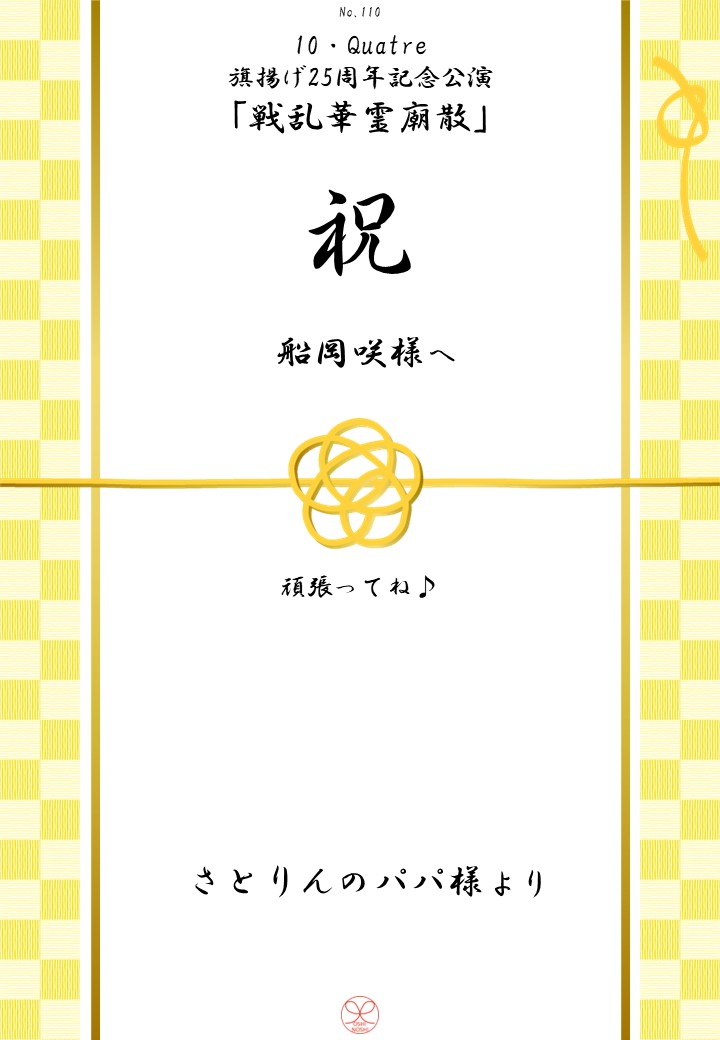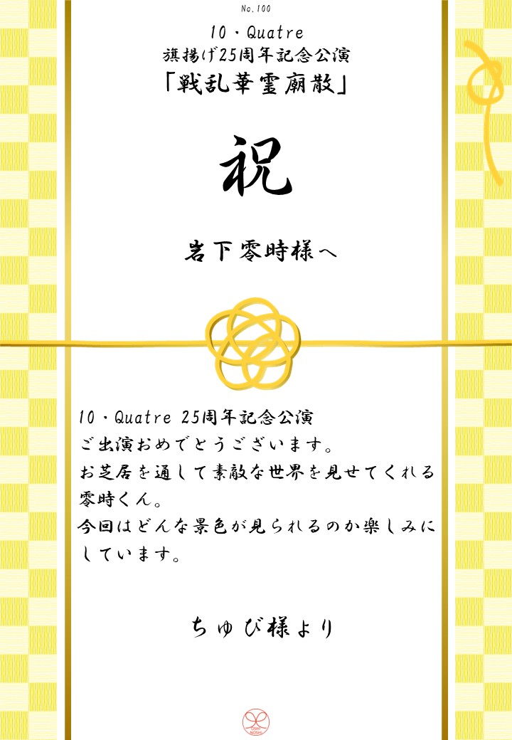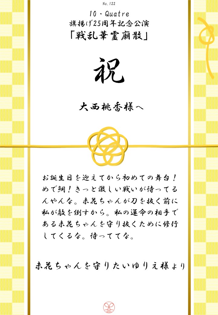 10・Quatre 旗揚げ25周年記念公演「戦乱華霊廟散」おしのしギャラリー 投稿日 2025年8月3日 更新日 2025年9月30日 著者 OSHINOSHI ギャラリーカテゴリ 公演応援のしギャラリー 10・Quatre 旗揚げ25周年記念公演「戦乱華霊廟散」の応援のし&差入れのしを掲示します。 応援のし募集中です。
