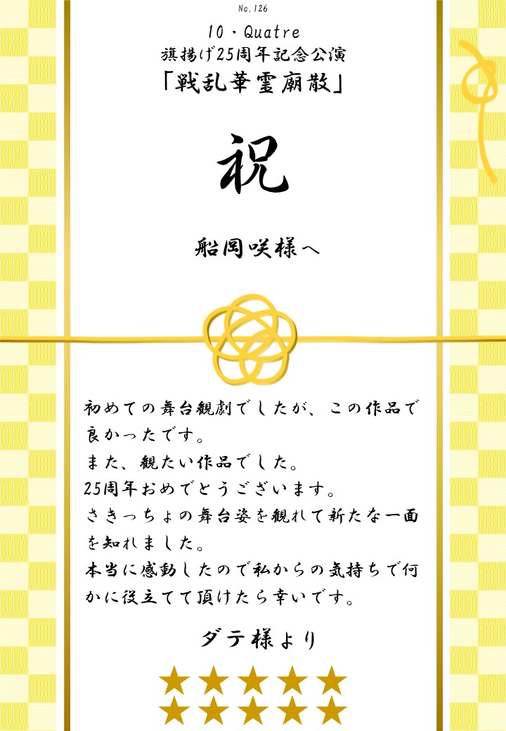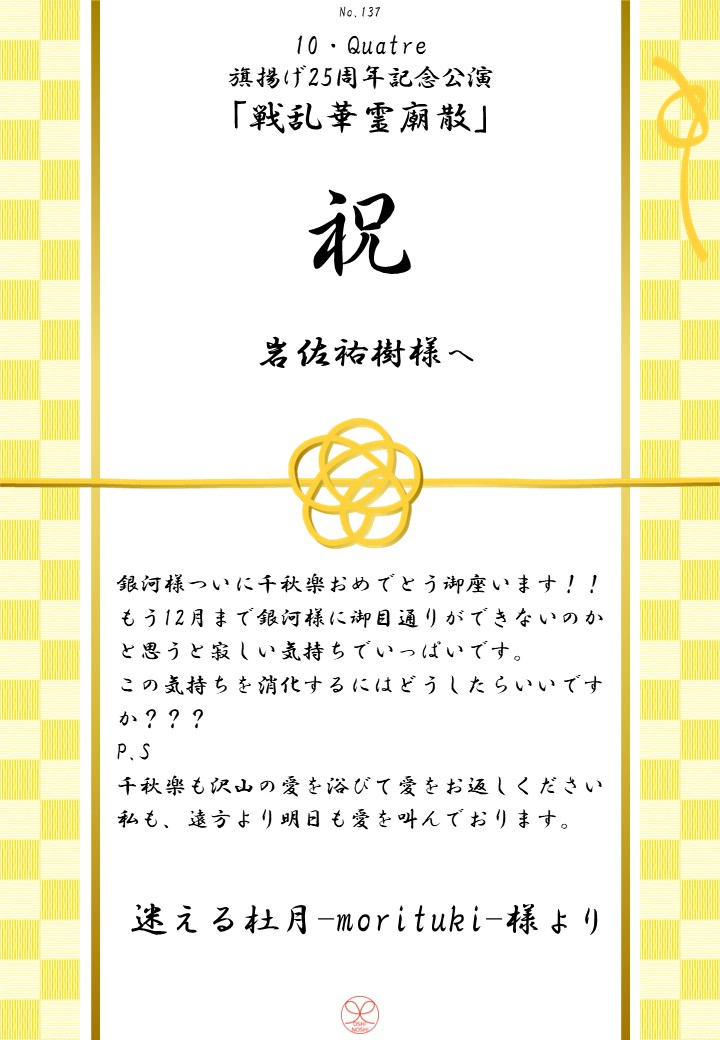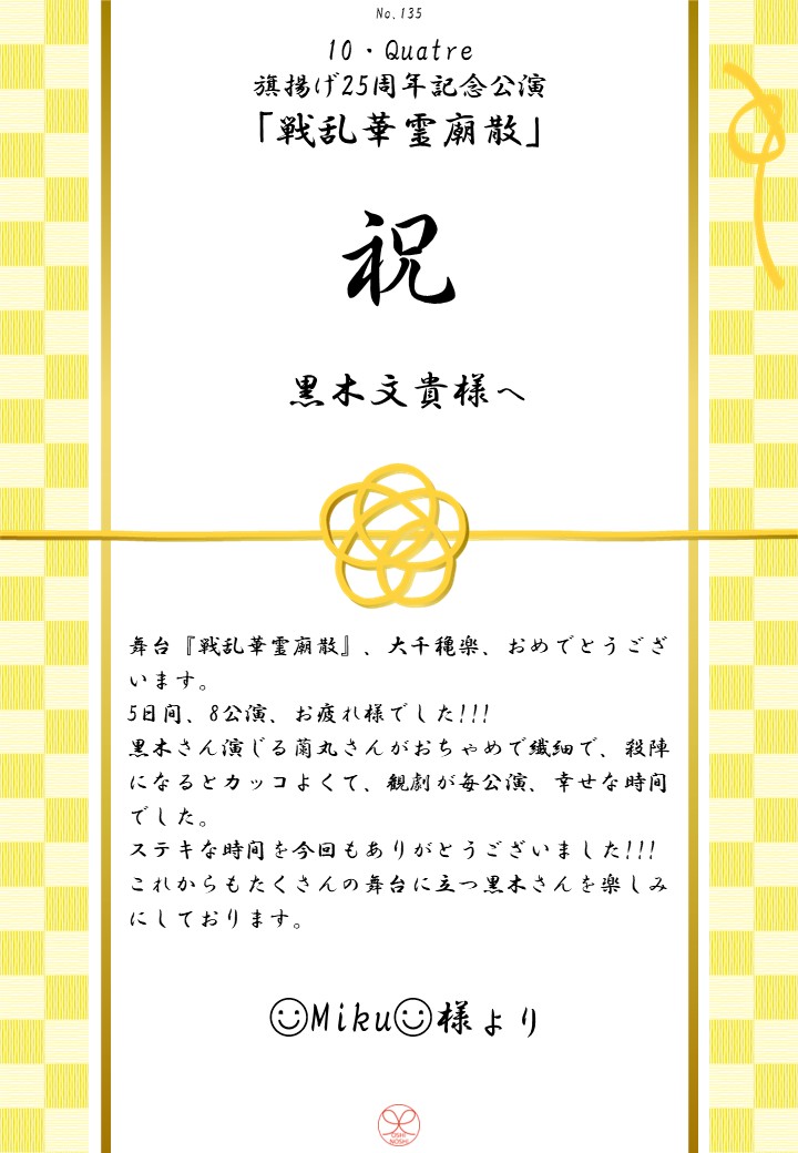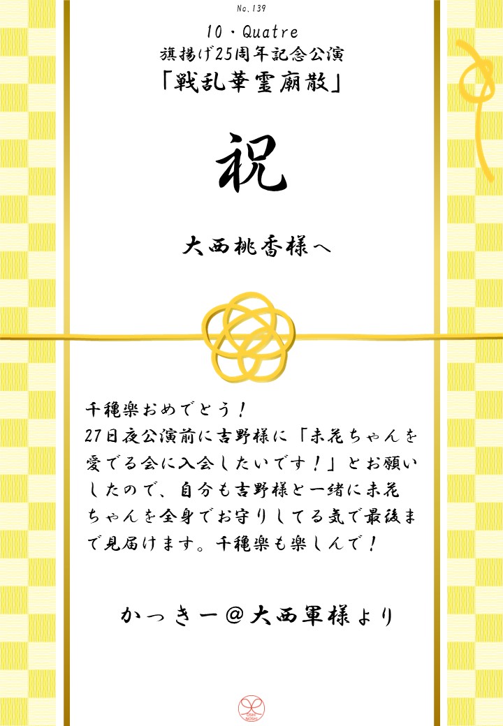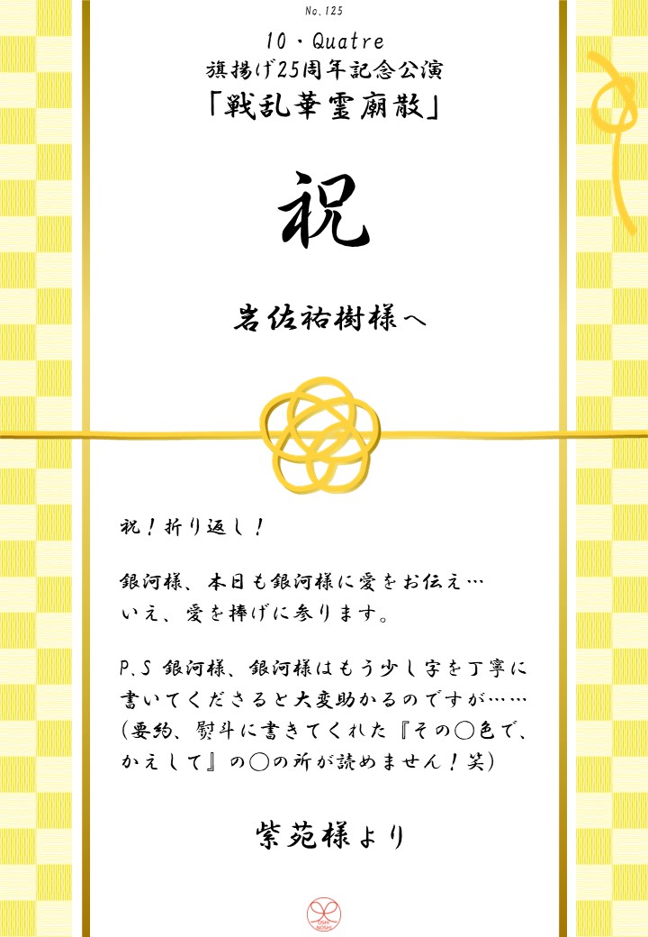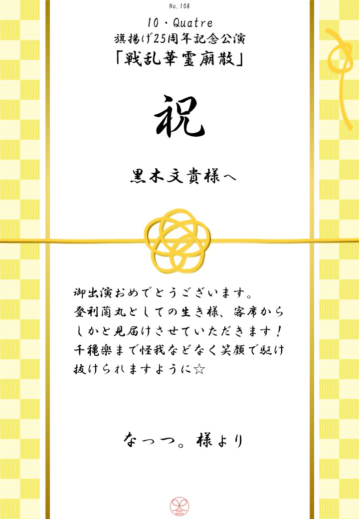 10・Quatre 旗揚げ25周年記念公演「戦乱華霊廟散」おしのしギャラリー 投稿日 2025年8月3日 更新日 2025年9月30日 著者 OSHINOSHI ギャラリーカテゴリ 公演応援のしギャラリー 10・Quatre 旗揚げ25周年記念公演「戦乱華霊廟散」の応援のし&差入れのしを掲示します。 応援のし募集中です。