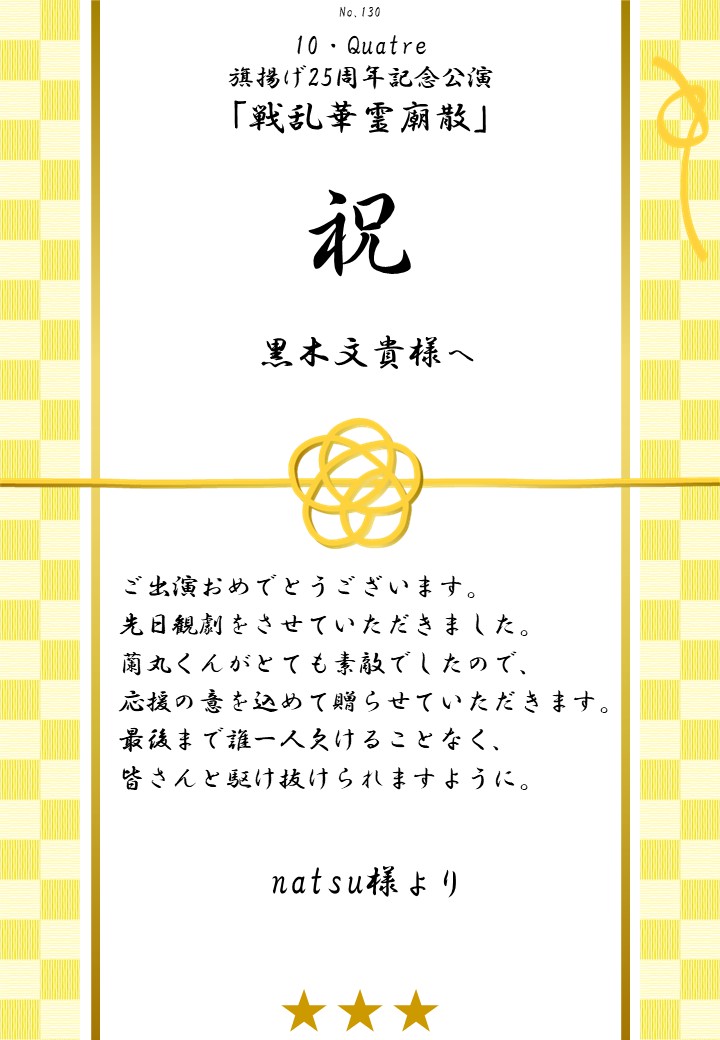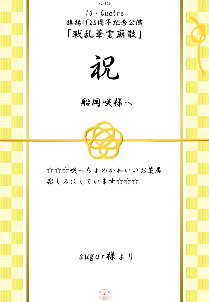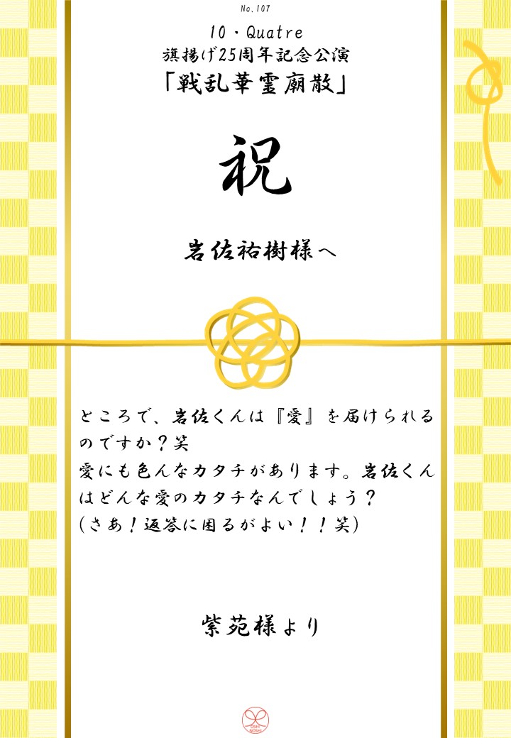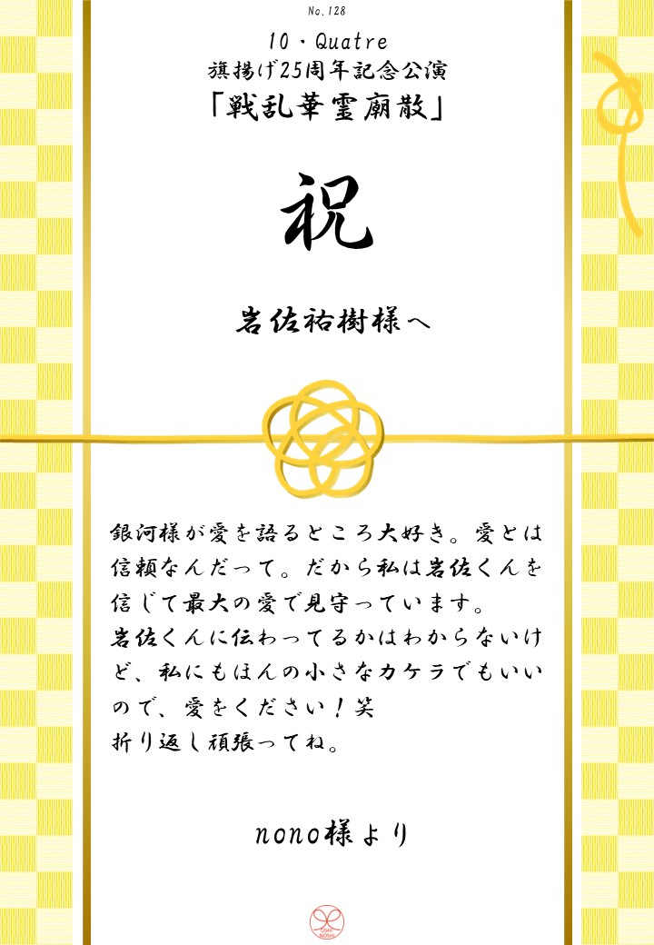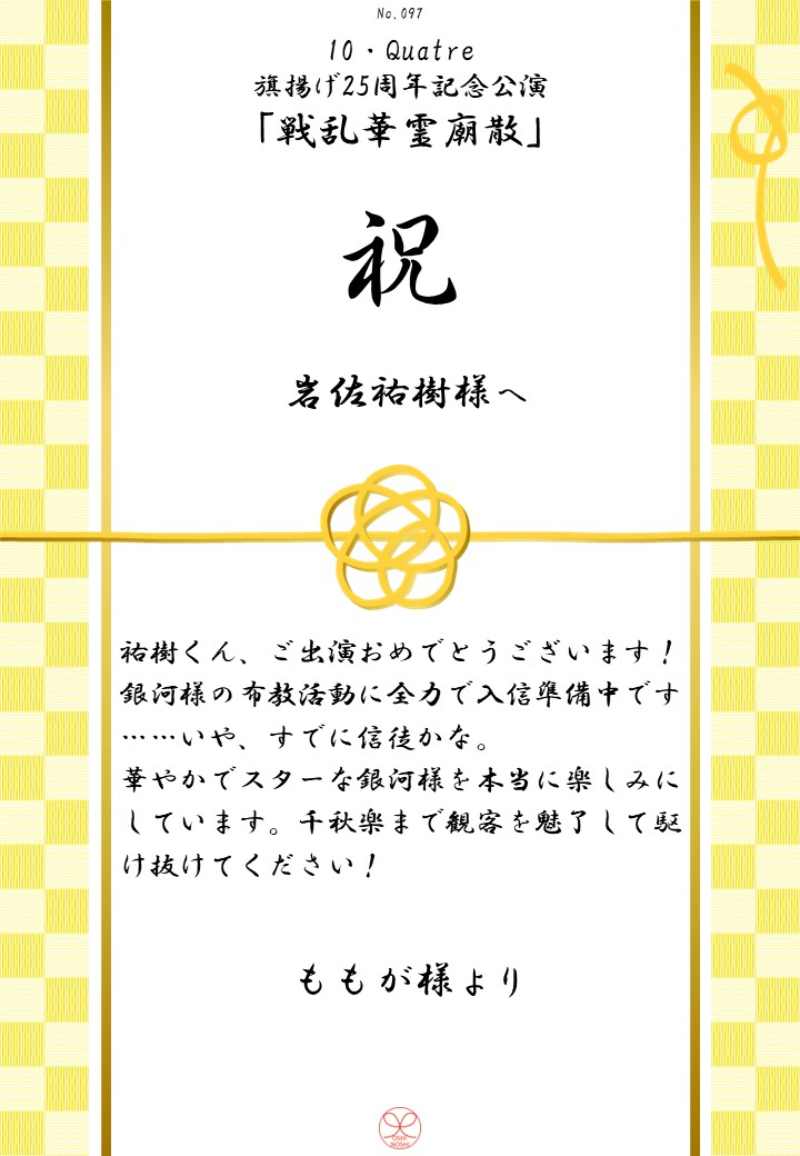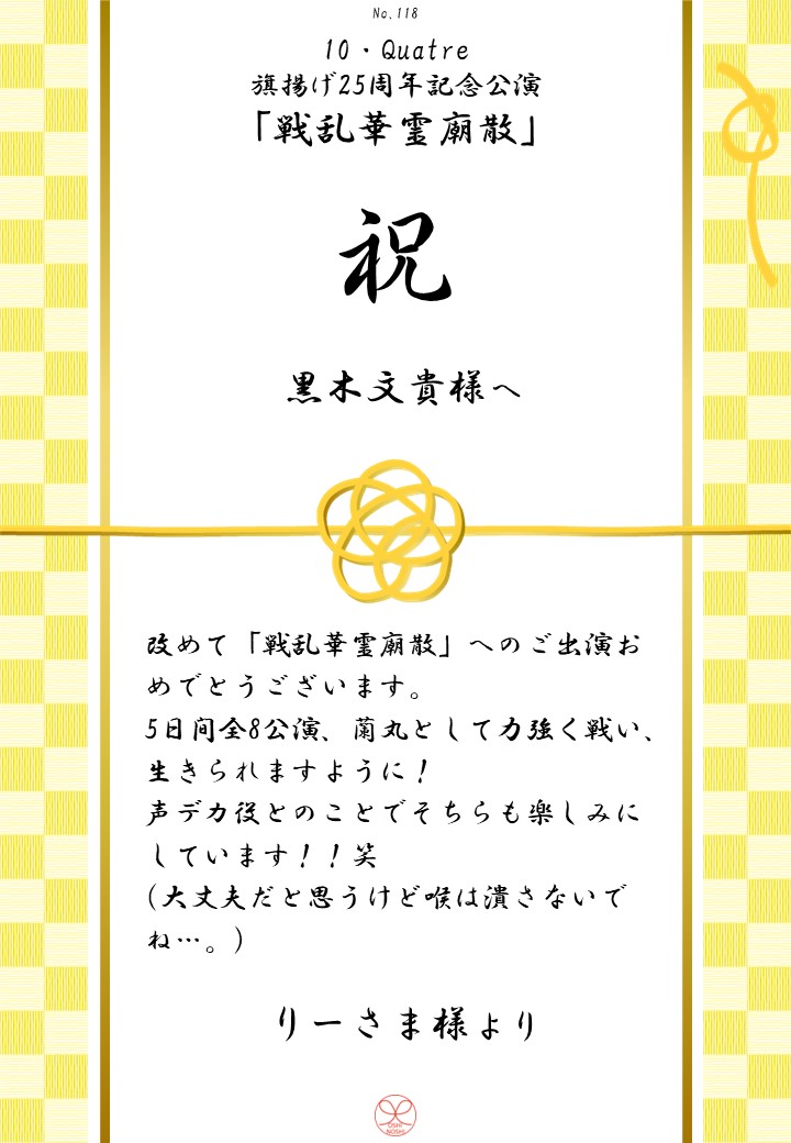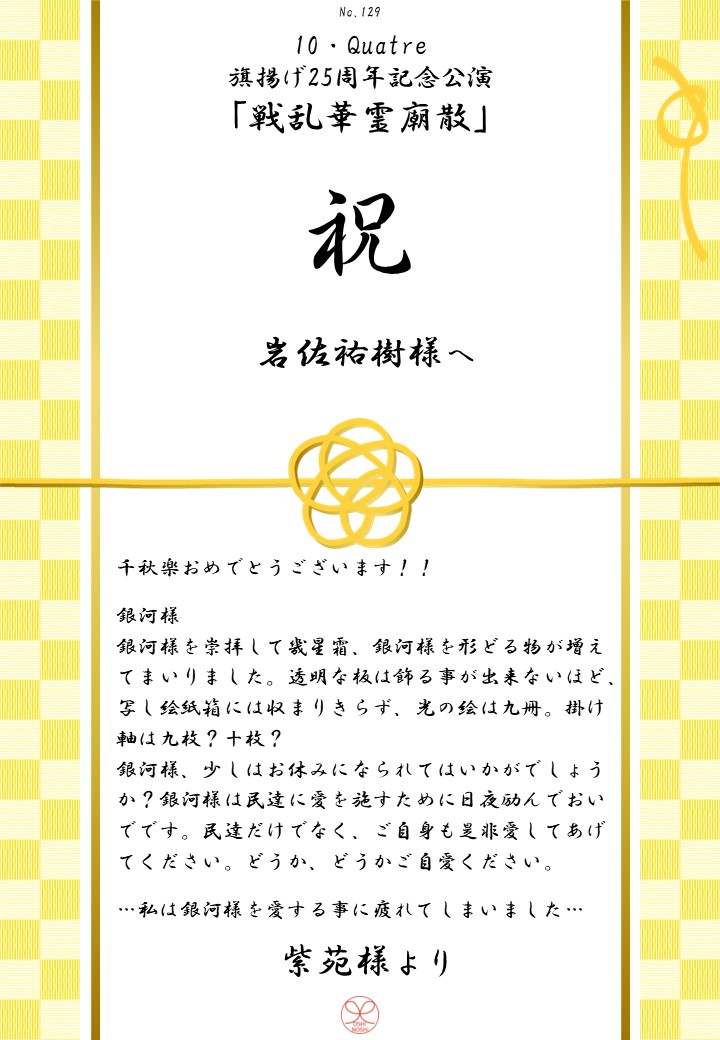 10・Quatre 旗揚げ25周年記念公演「戦乱華霊廟散」おしのしギャラリー 投稿日 2025年8月3日 更新日 2025年9月30日 著者 OSHINOSHI ギャラリーカテゴリ 公演応援のしギャラリー 10・Quatre 旗揚げ25周年記念公演「戦乱華霊廟散」の応援のし&差入れのしを掲示します。 応援のし募集中です。