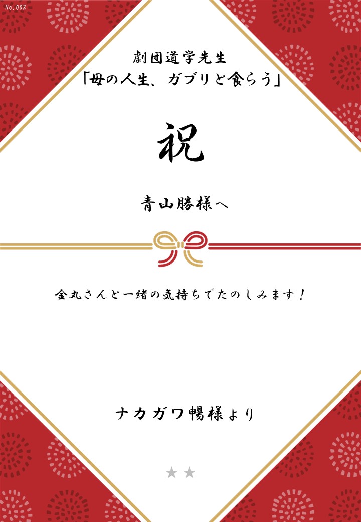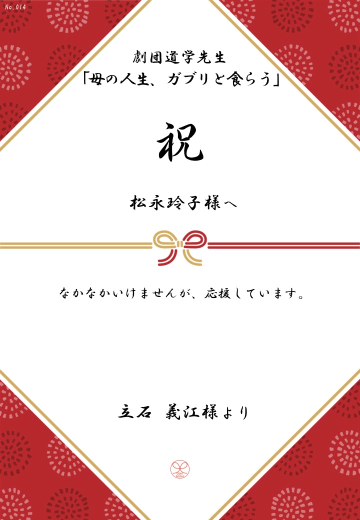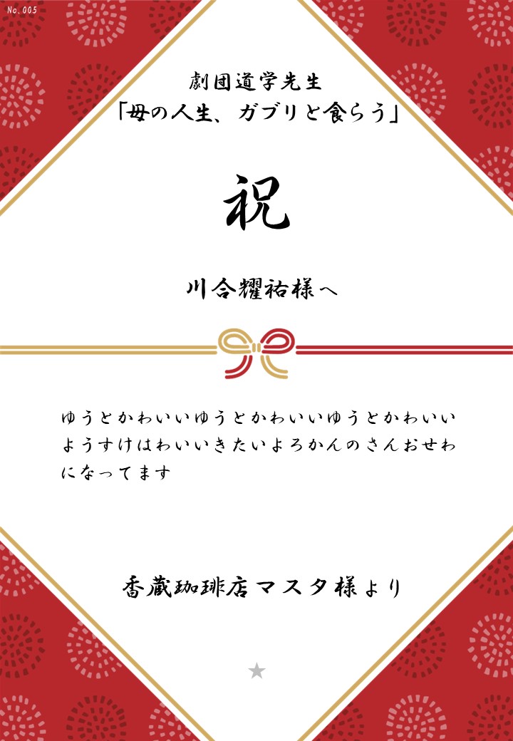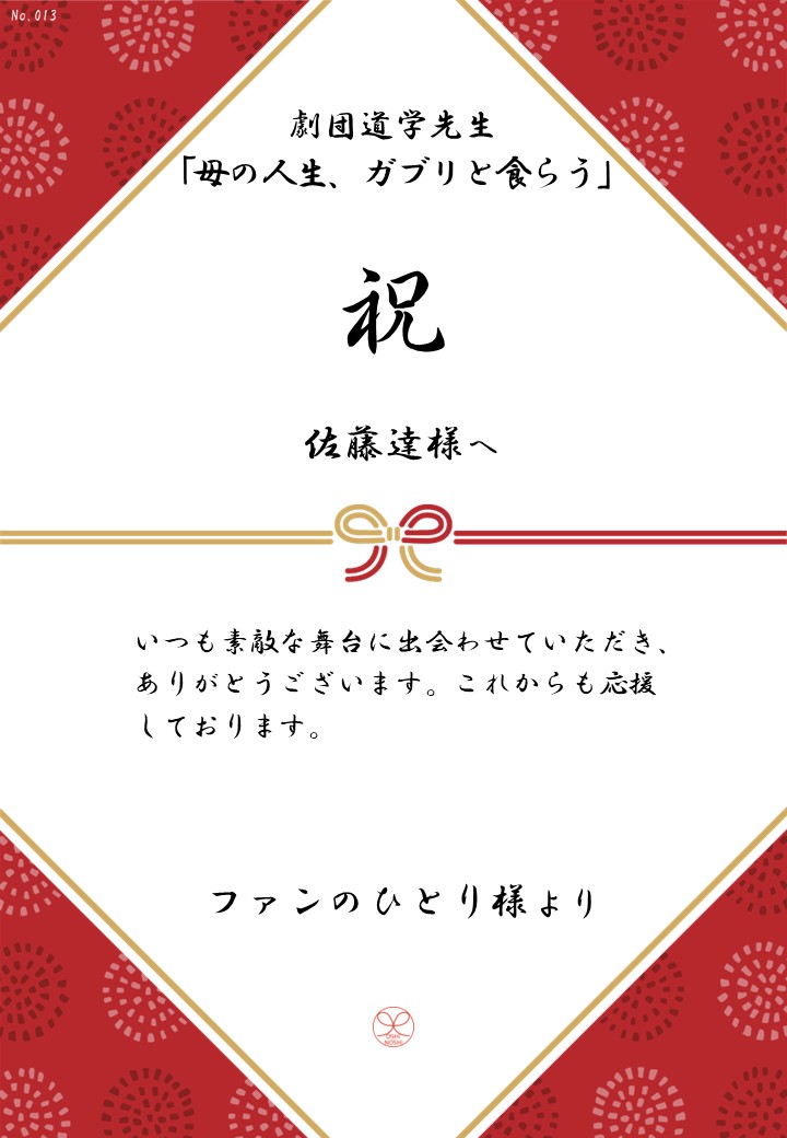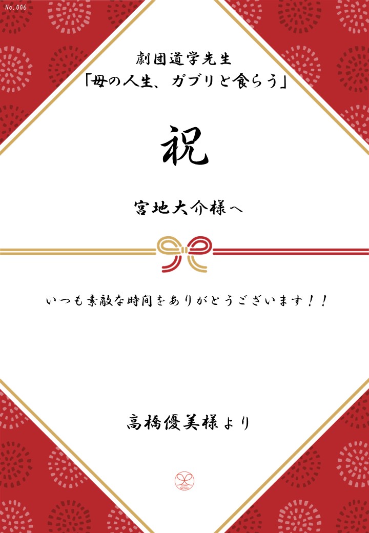 劇団道学先生「母の人生、ガブリと食らう」応援のしギャラリー 投稿日 2026年3月17日 更新日 2026年4月13日 著者 OSHINOSHI ギャラリーカテゴリ 公演応援のしギャラリー 劇団道学先生「母の人生、ガブリと食らう」の応援のしを掲示します。 応援のし一覧