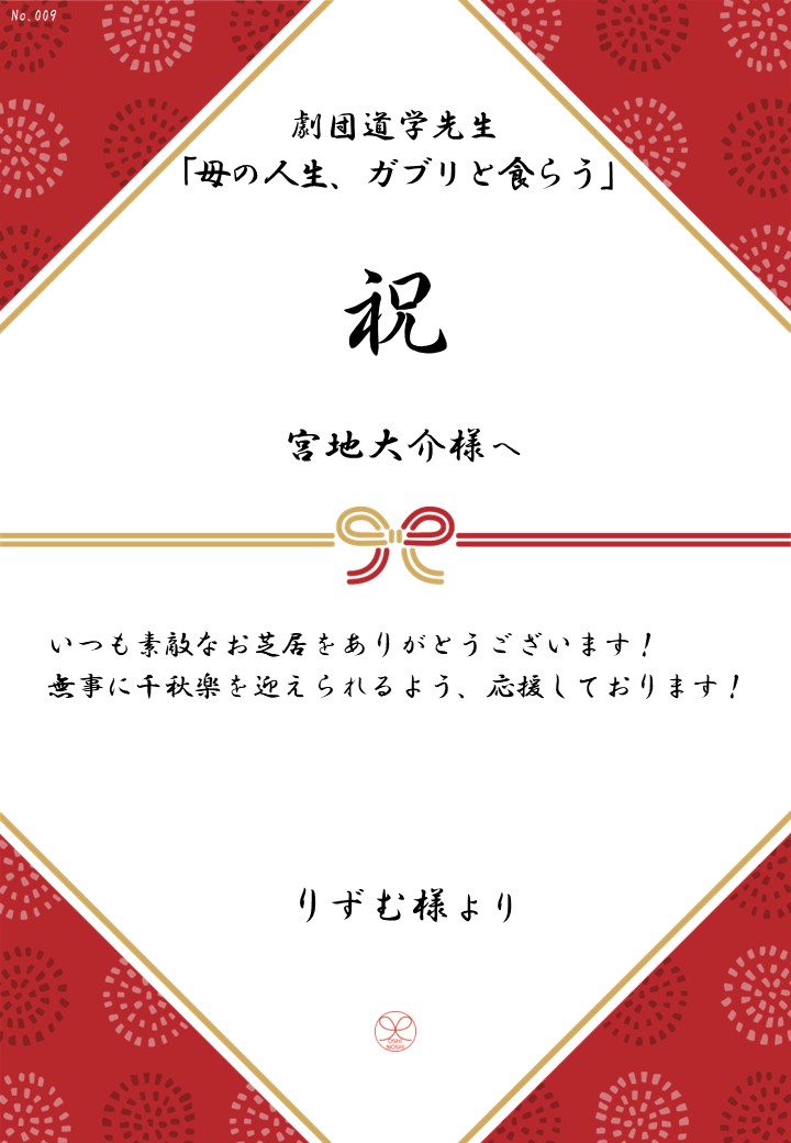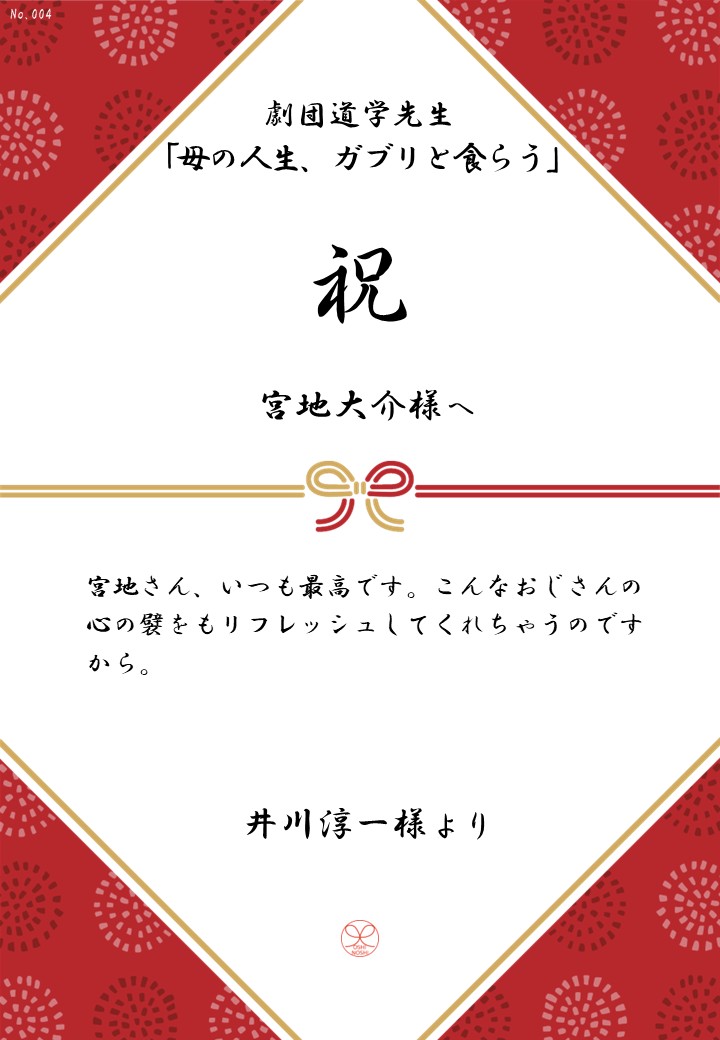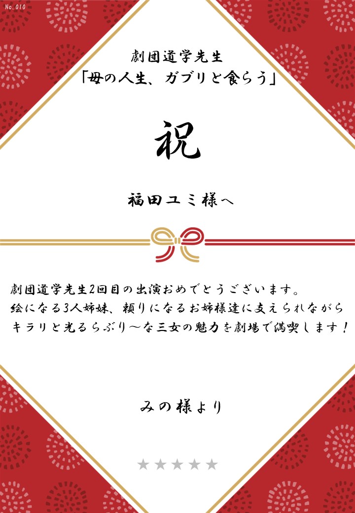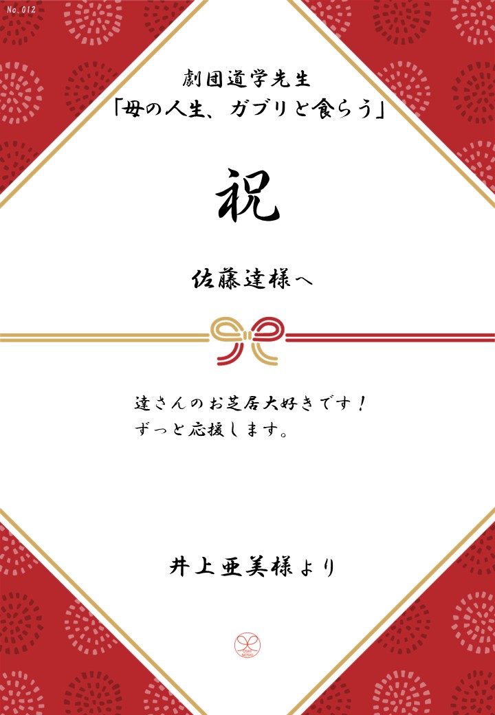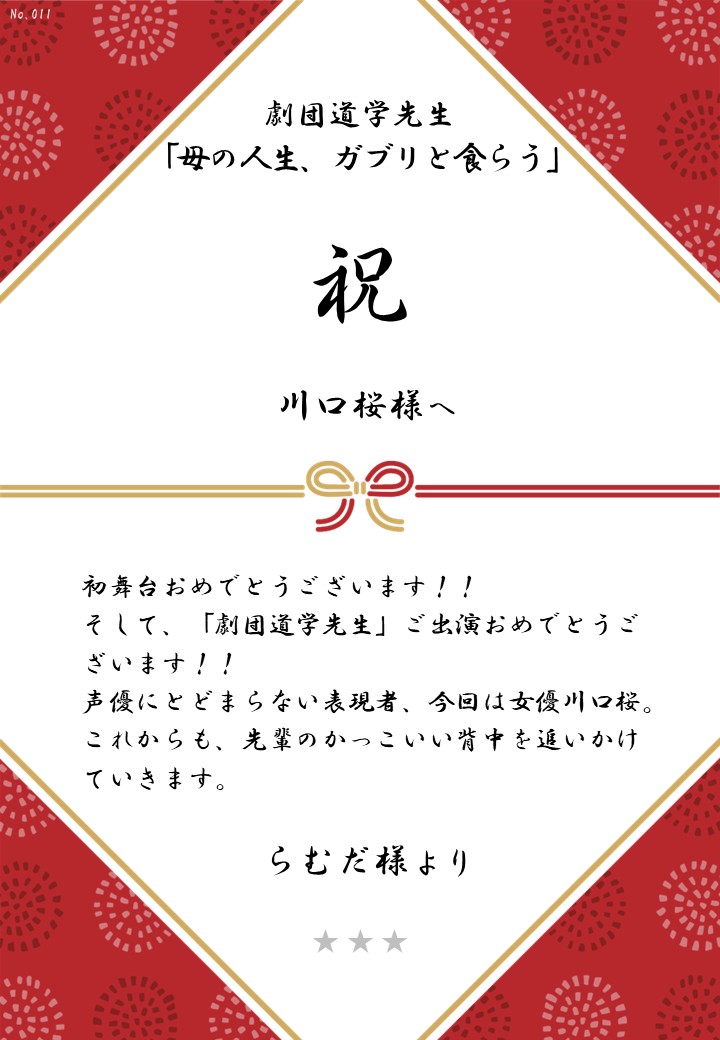 劇団道学先生「母の人生、ガブリと食らう」応援のしギャラリー 投稿日 2026年3月17日 更新日 2026年4月13日 著者 OSHINOSHI ギャラリーカテゴリ 公演応援のしギャラリー 劇団道学先生「母の人生、ガブリと食らう」の応援のしを掲示します。 応援のし一覧