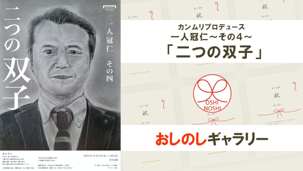 カンムリプロデュース 一人冠仁~その4~ 「二つの双子」おしのしギャラリー 投稿日 2025年10月2日 更新日 2025年10月7日 著者 OSHINOSHI ギャラリーカテゴリ 公演応援のしギャラリー カンムリプロデュース 一人冠仁~その4~ 「二つの双子」のおしのしを掲示します。 おしのし申込み 公演詳細情報 おしのし一覧 応援のし募集中です。 \ 応援よろしくお願いします /おしのしを申込む