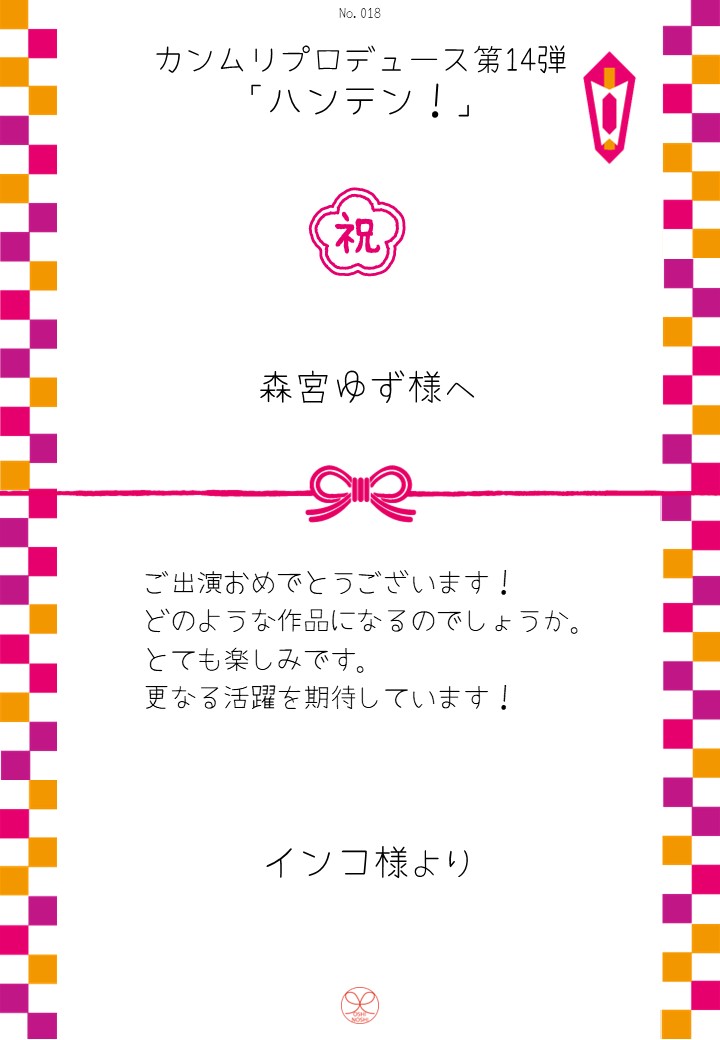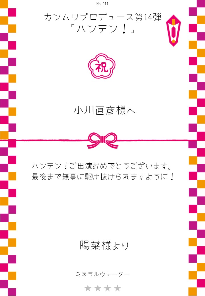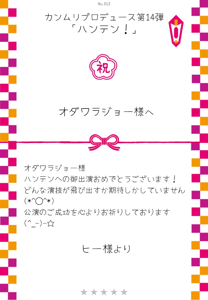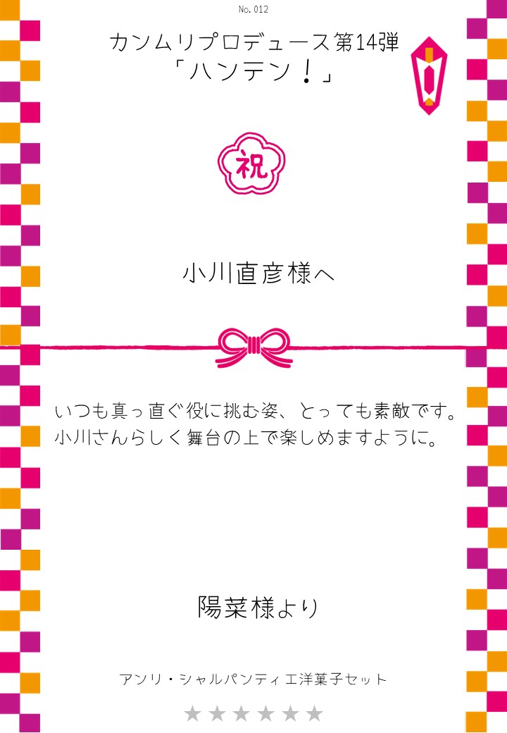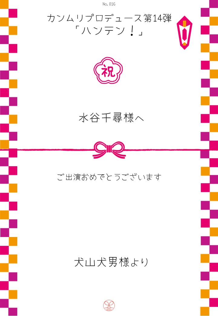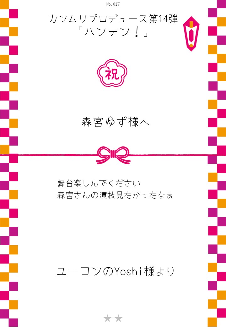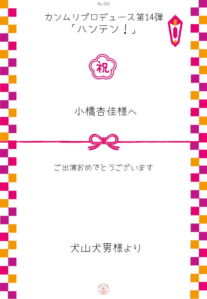 カンムリプロデュース第14弾「ハンテン!」おしのしギャラリー 投稿日 2025年8月5日 更新日 2025年10月12日 著者 OSHINOSHI ギャラリーカテゴリ 公演応援のしギャラリー カンムリプロデュース第14弾「ハンテン!」の応援のし&差入れのしを掲示します。 おしのし申込み 公演詳細情報 応援のし募集中です。 \ 応援よろしくお願いします /熨斗を購入する