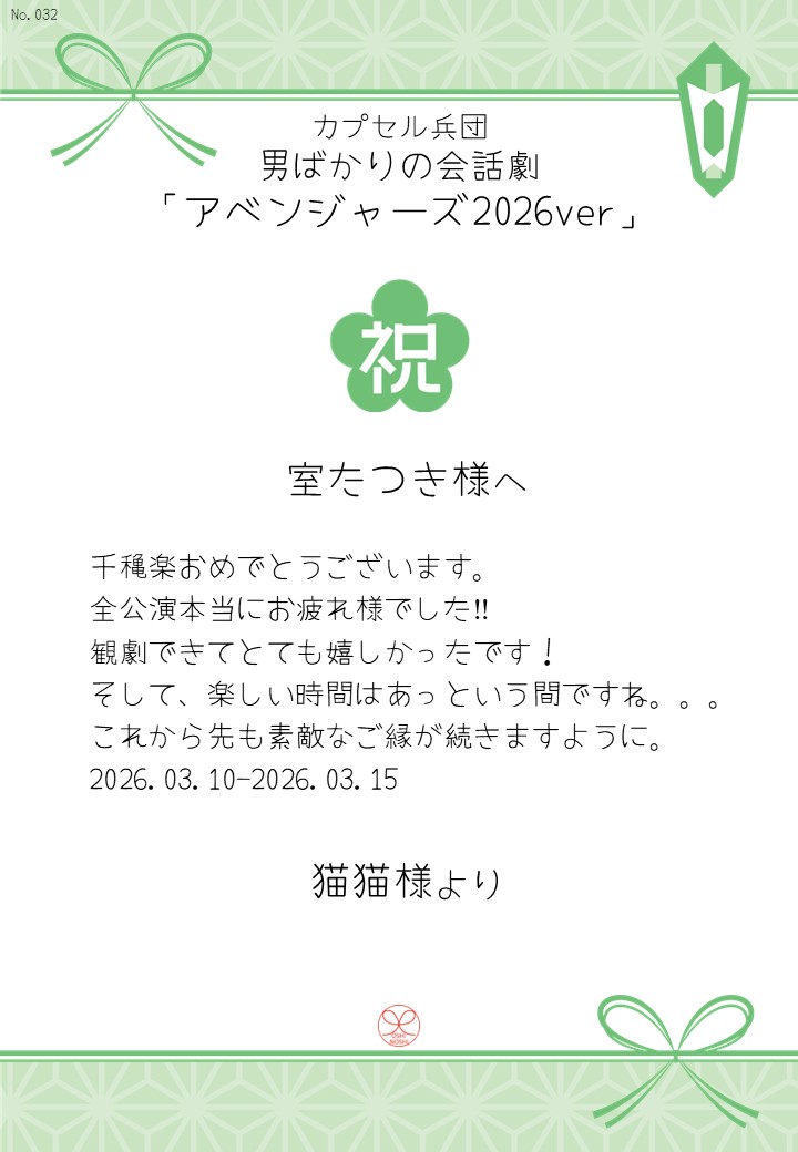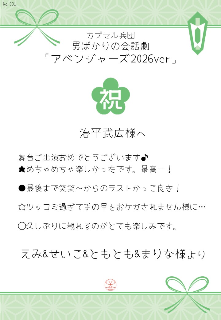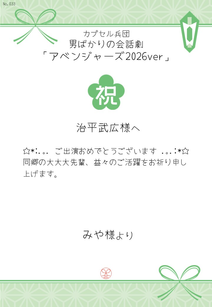 カプセル兵団 男ばかりの会話劇「アベンジャーズ2026ver」応援のしギャラリー 投稿日 2026年2月24日 更新日 2026年3月14日 著者 OSHINOSHI ギャラリーカテゴリ 公演応援のしギャラリー カプセル兵団 男ばかりの会話劇「アベンジャーズ2026ver」の応援のしを掲示します。 応援のし一覧 応援のし募集中です。