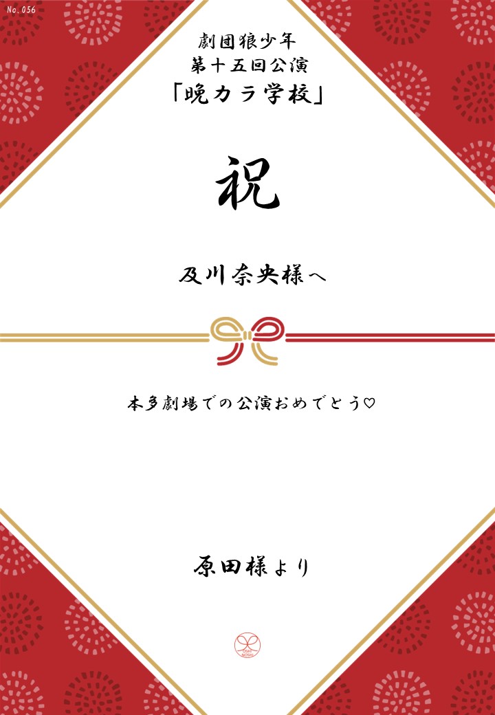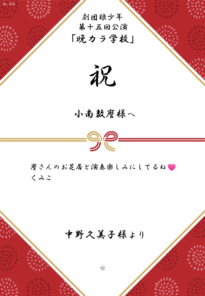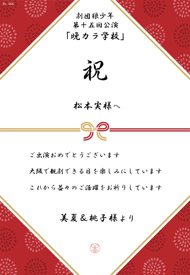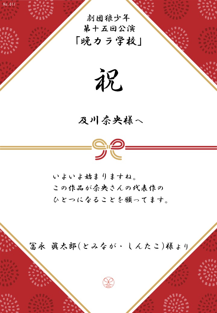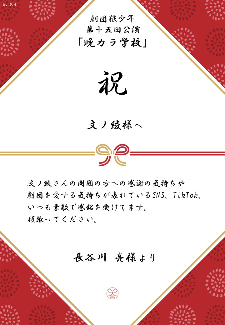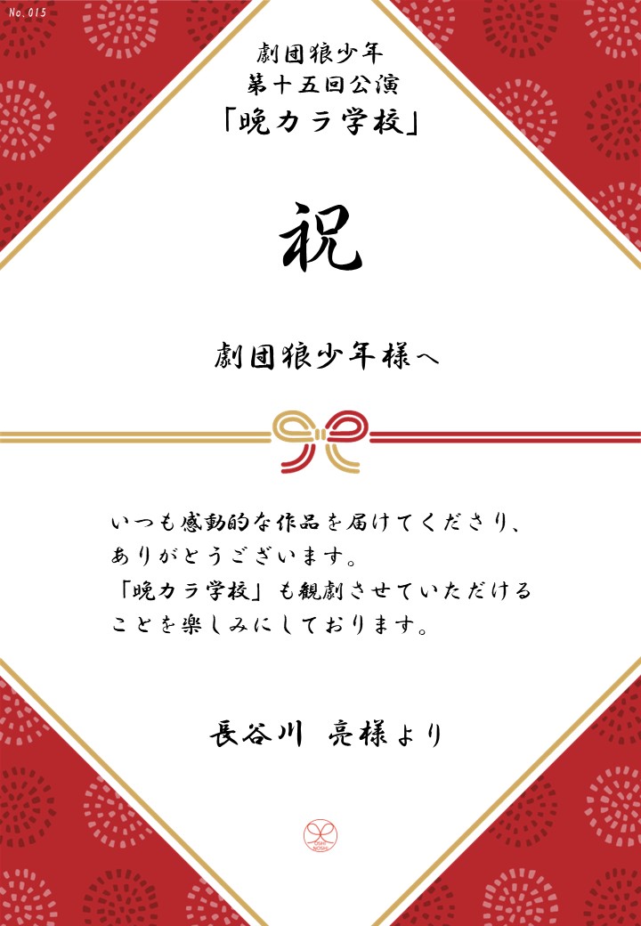 劇団狼少年 第十五回公演「晩カラ学校」の応援のしを掲示します。
