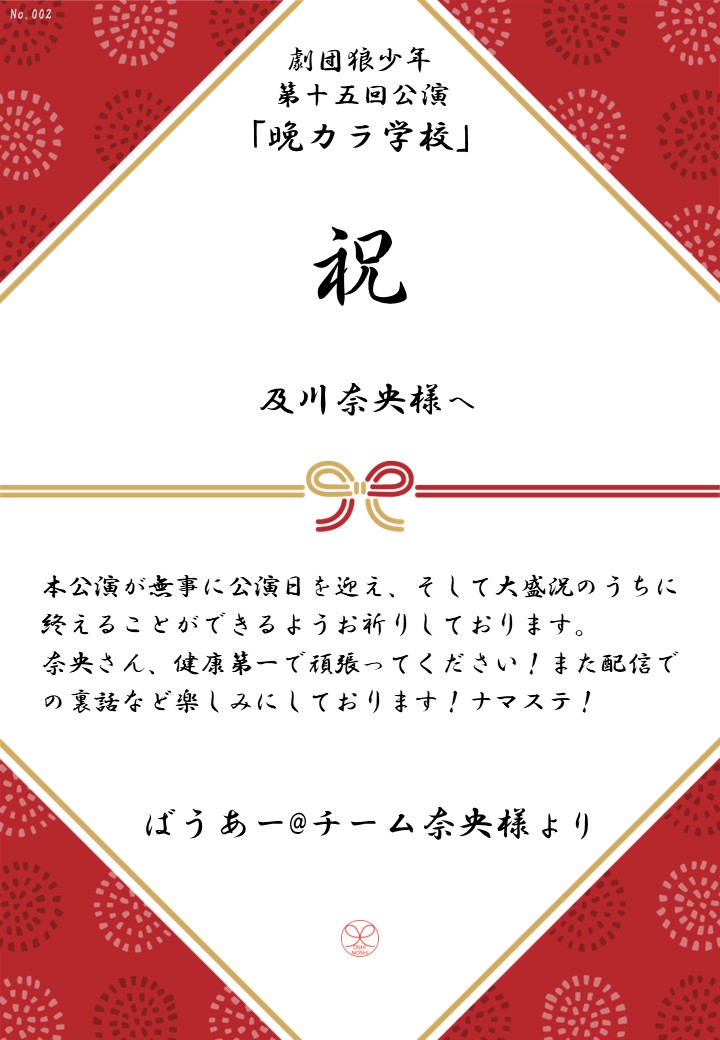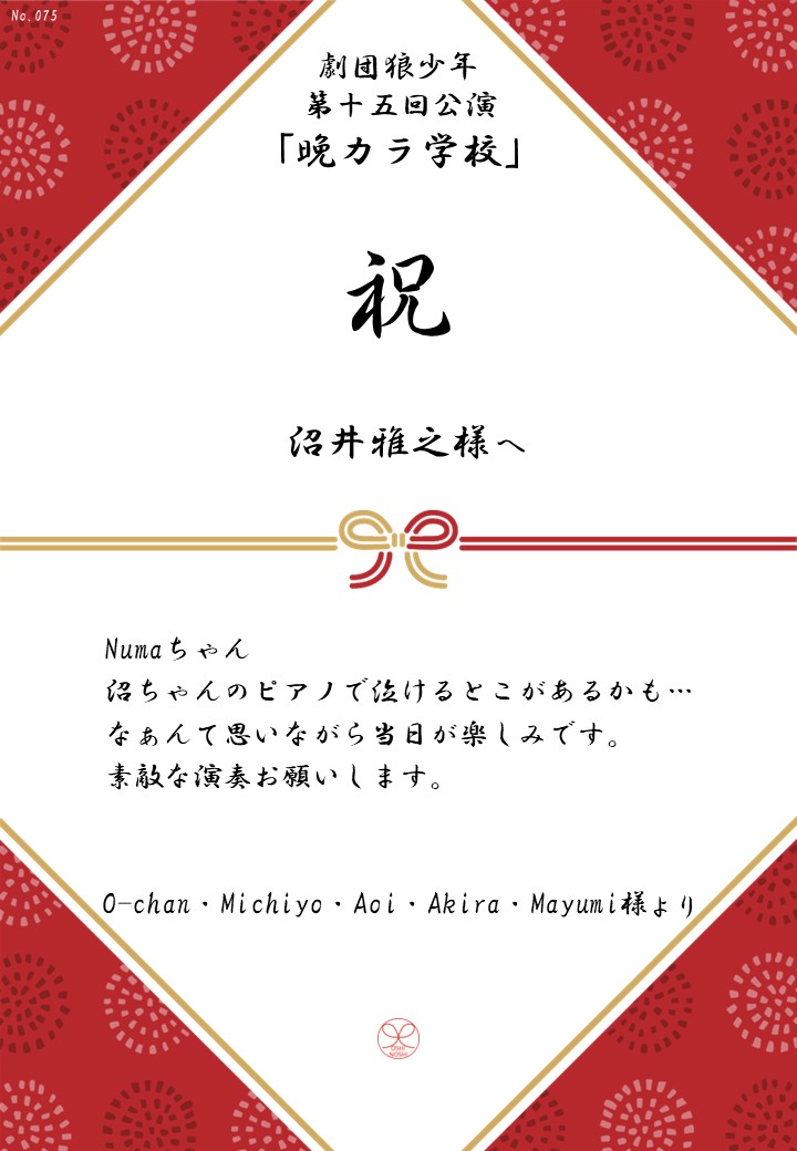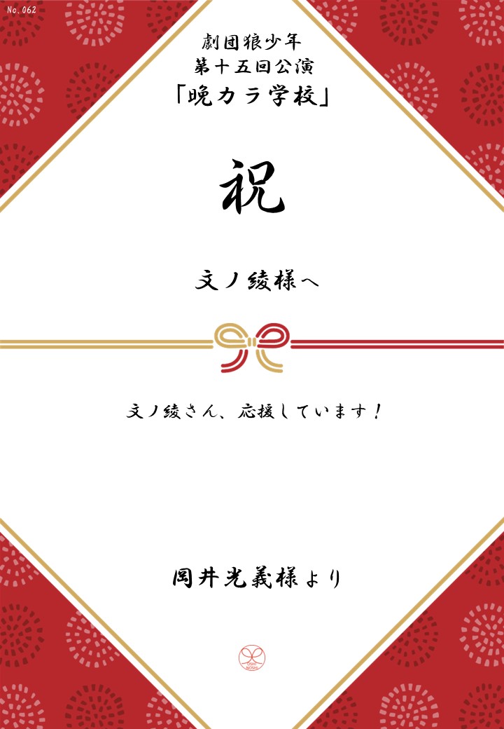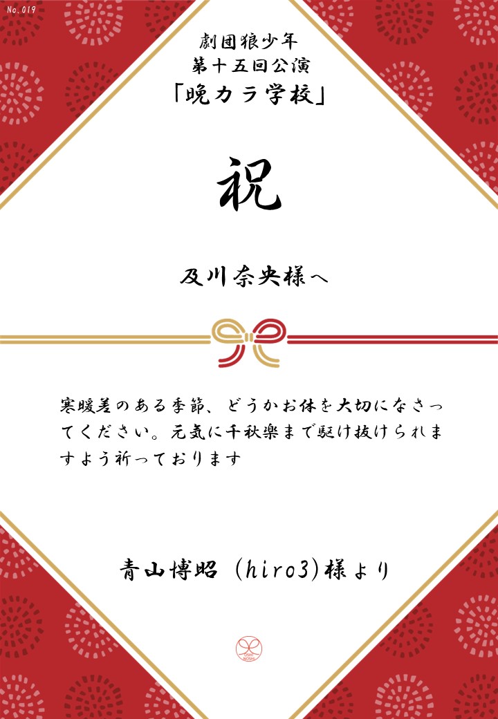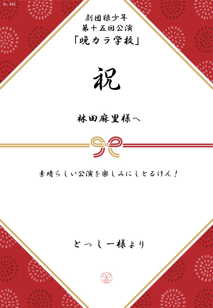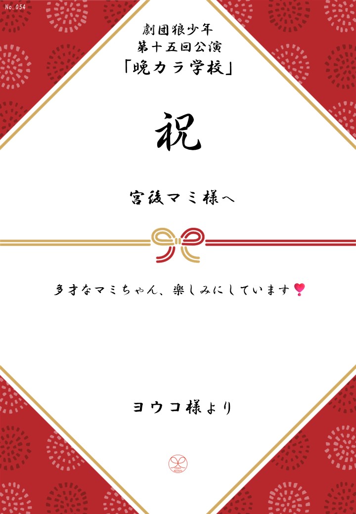 劇団狼少年 第十五回公演「晩カラ学校」の応援のしを掲示します。
