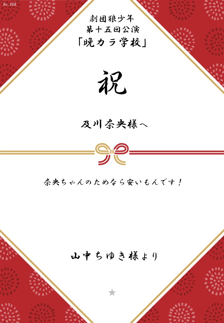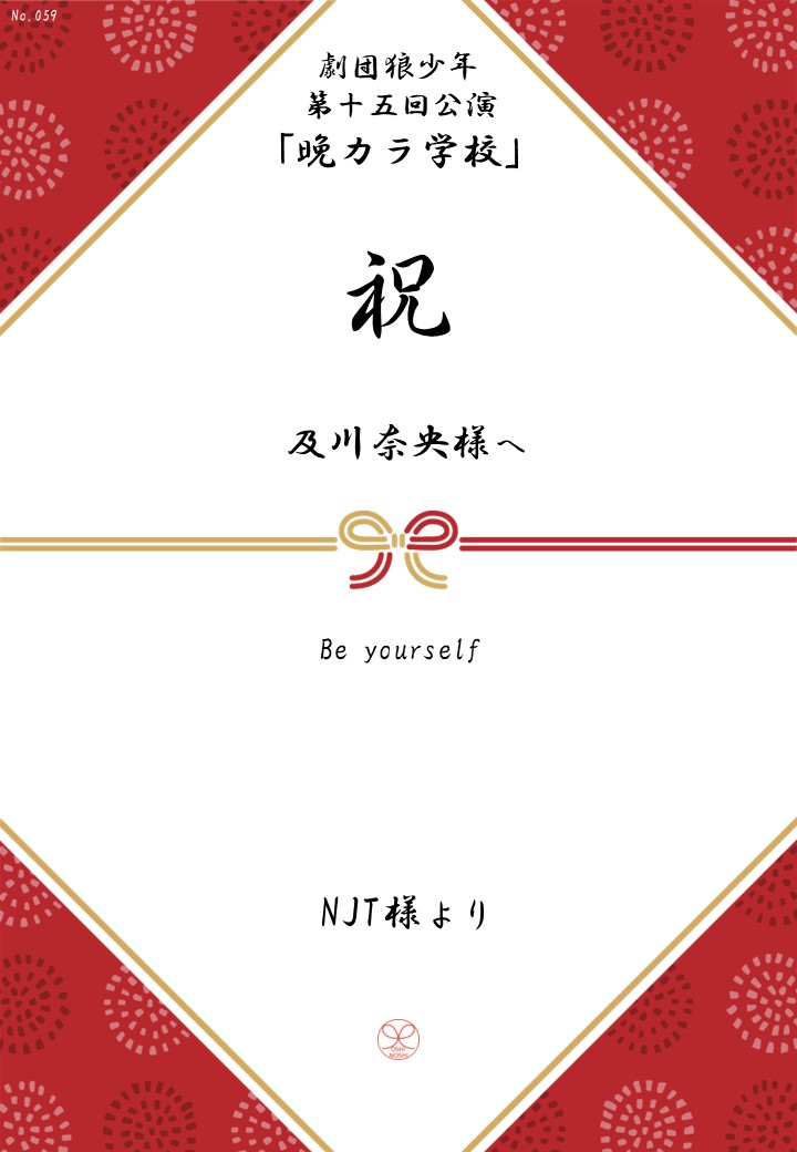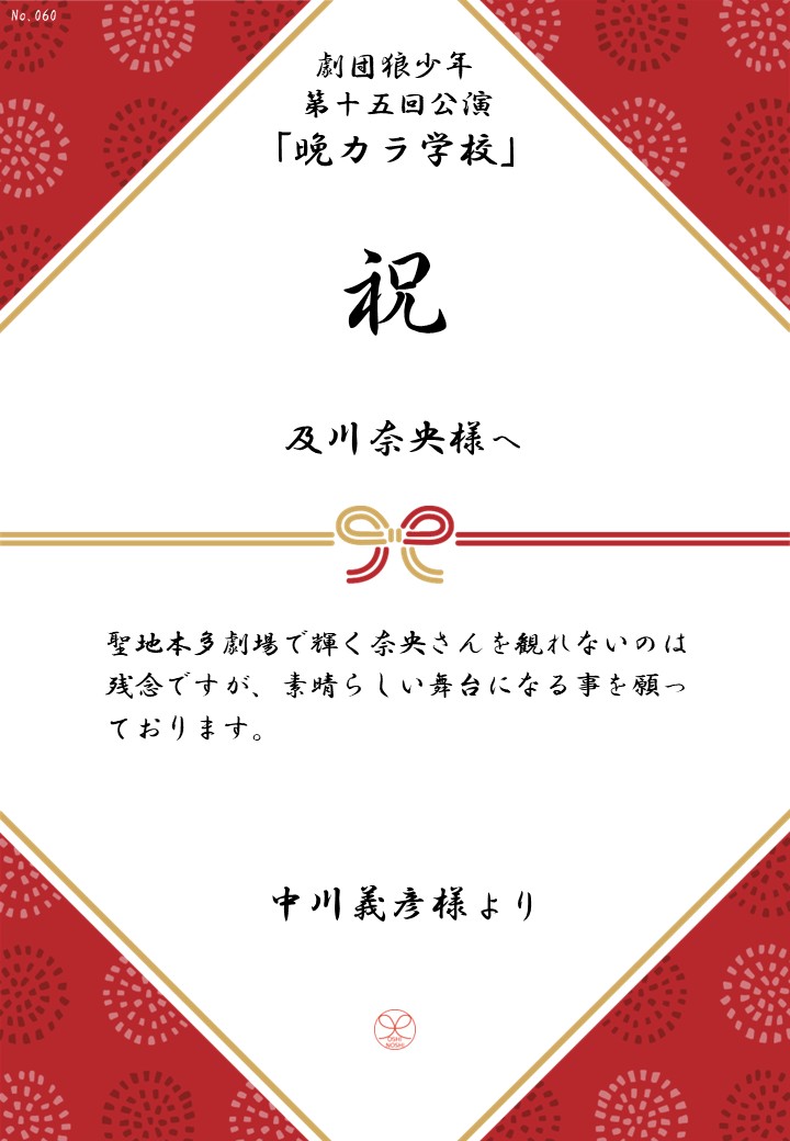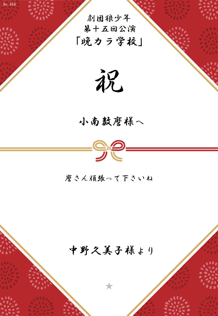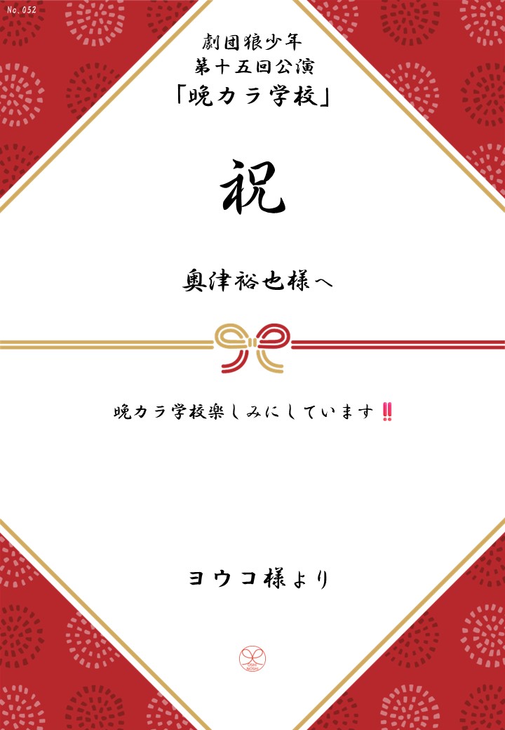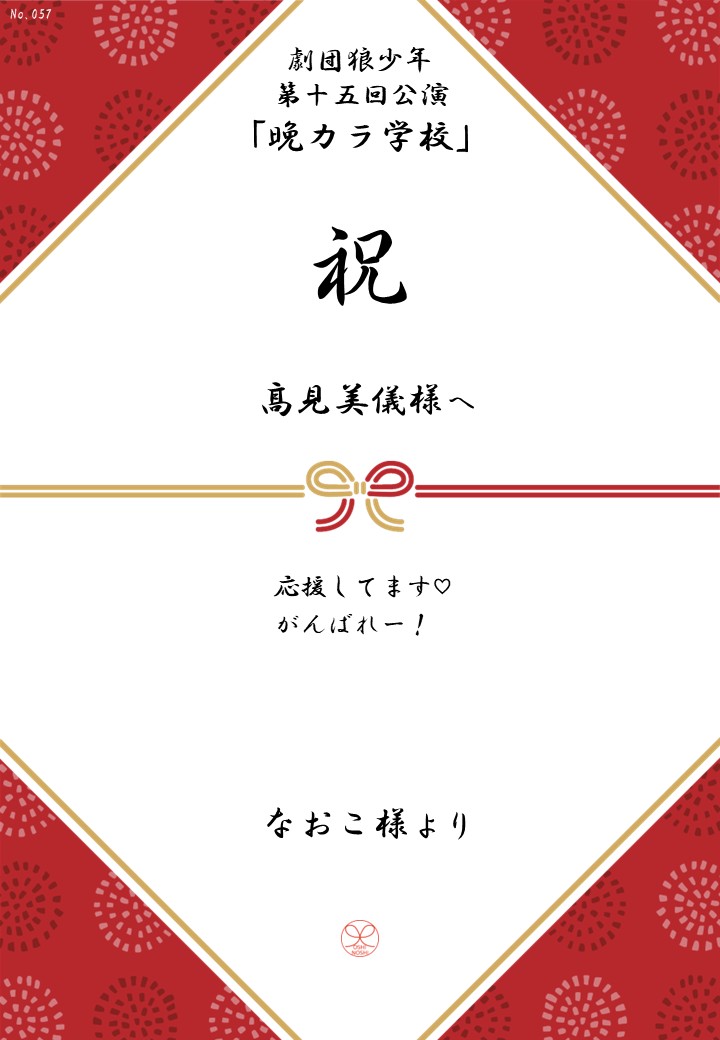 劇団狼少年 第十五回公演「晩カラ学校」の応援のしを掲示します。