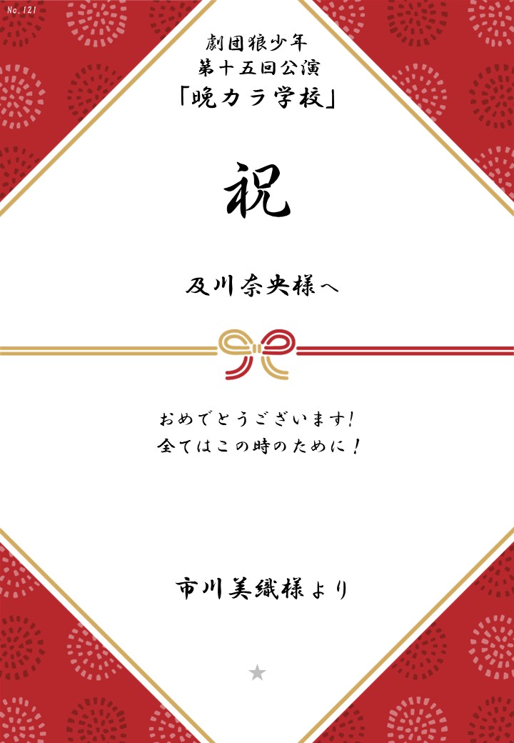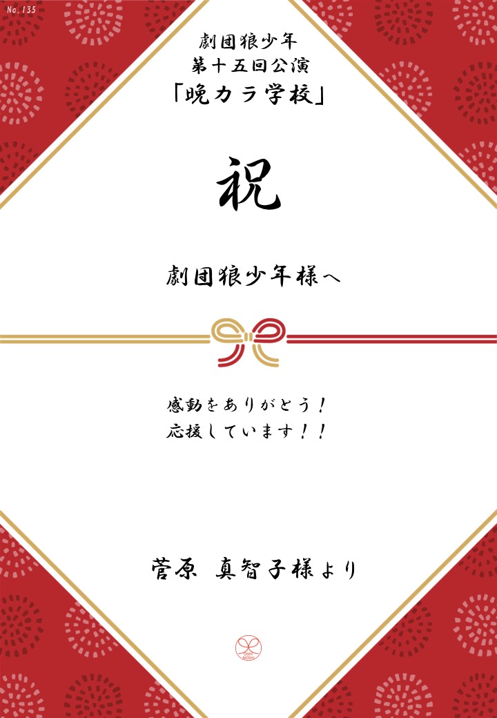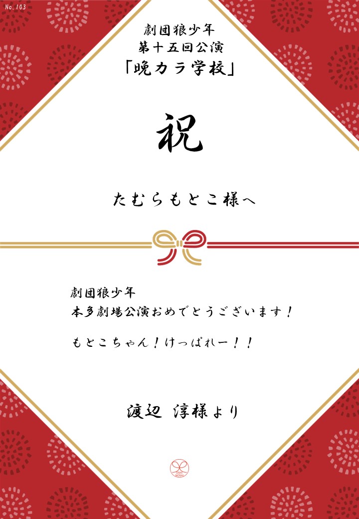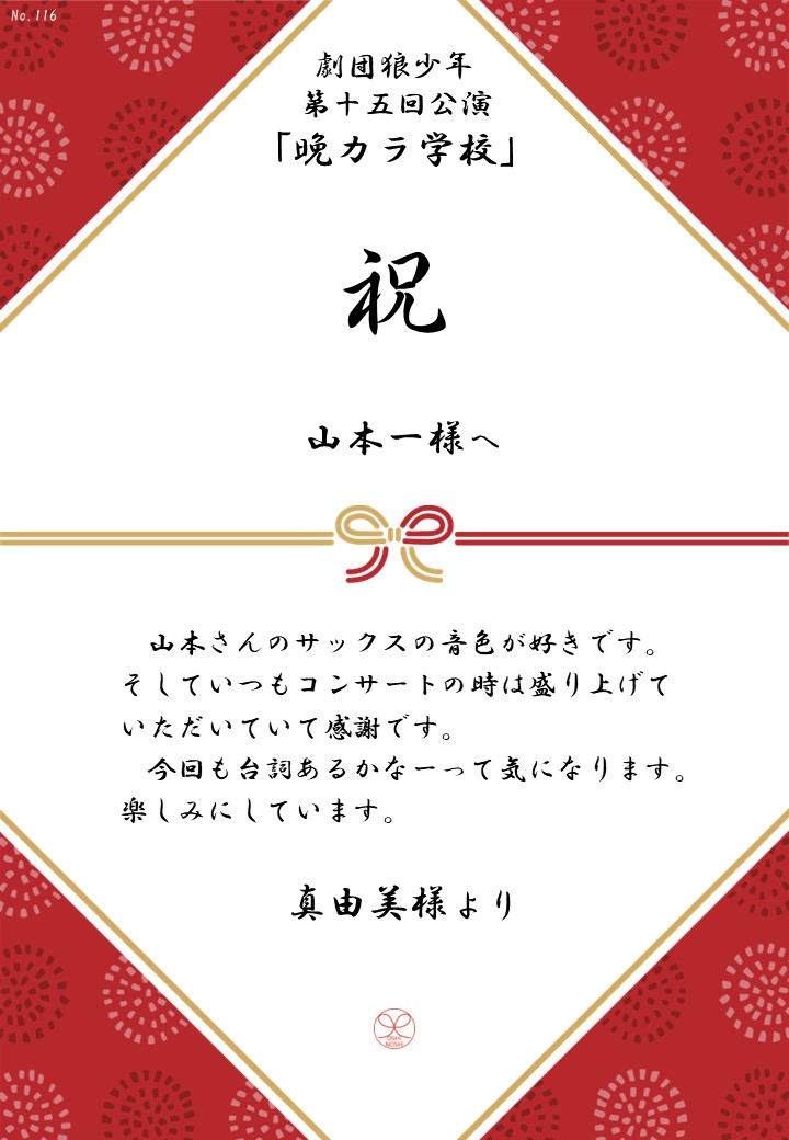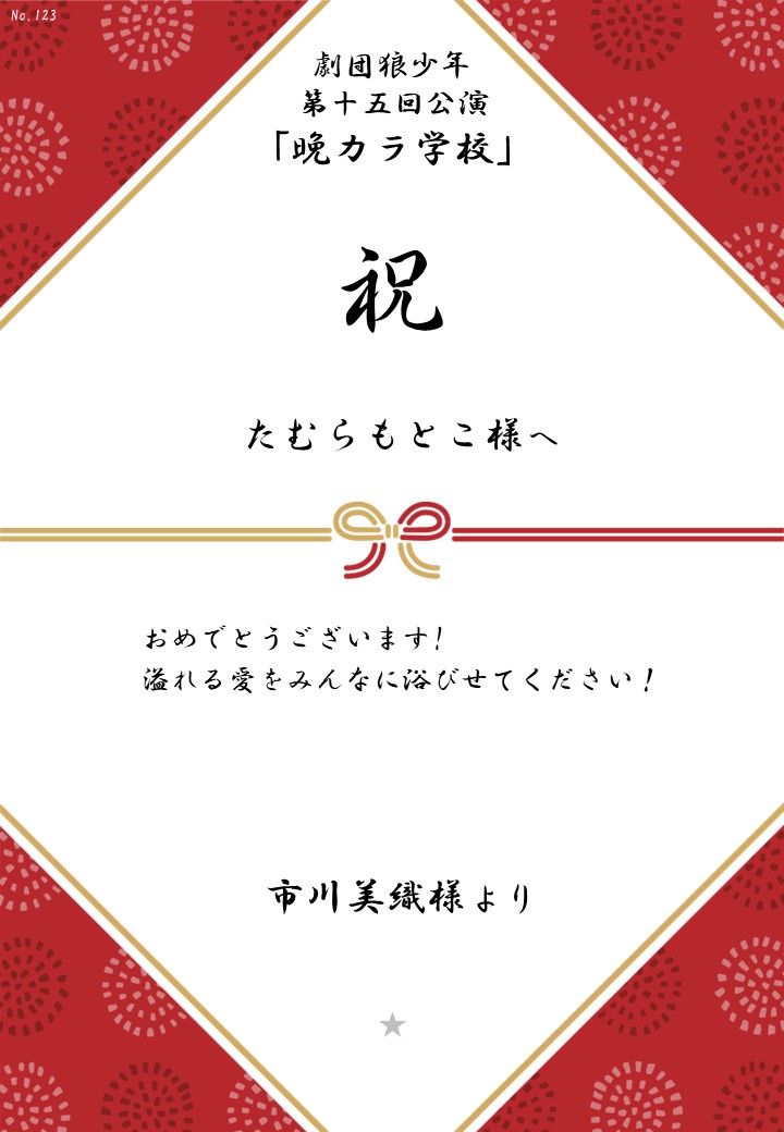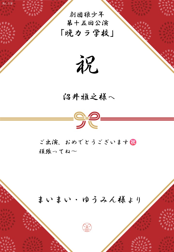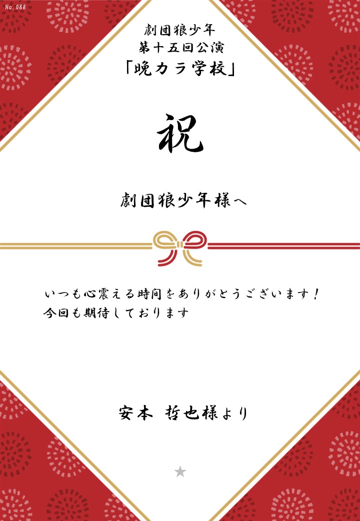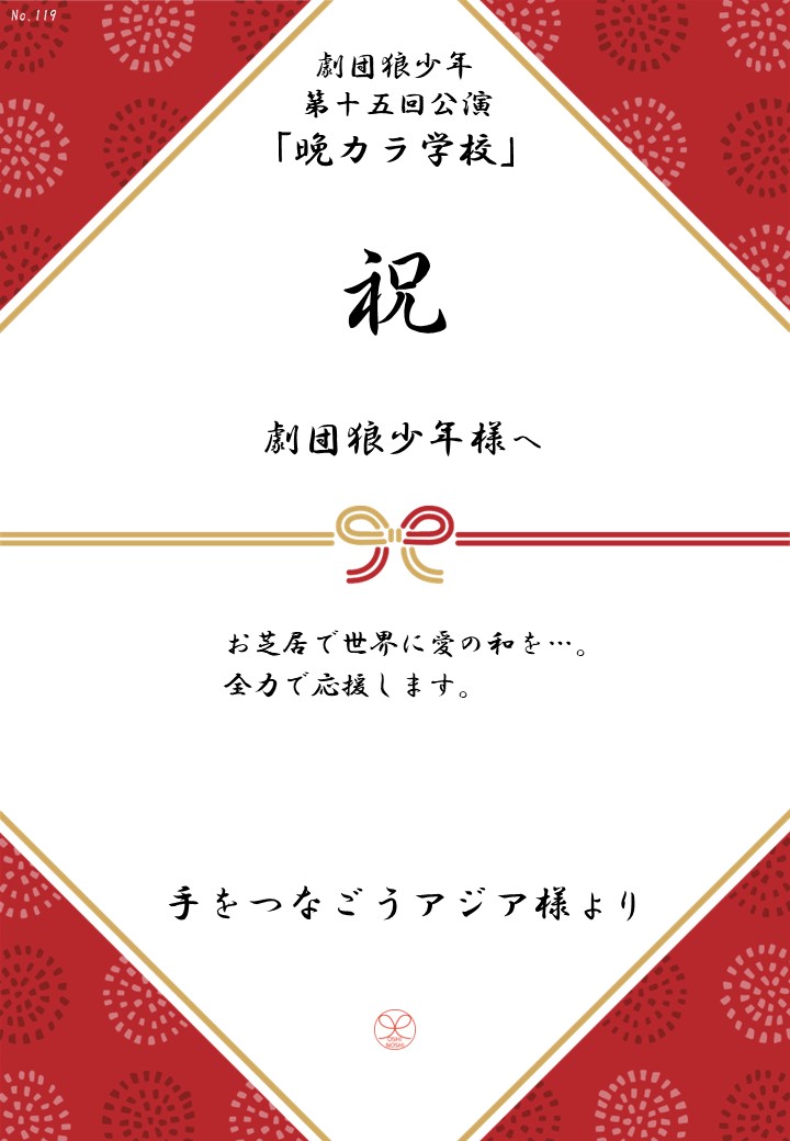 劇団狼少年 第十五回公演「晩カラ学校」応援のしギャラリー 投稿日 2026年1月23日 更新日 2026年2月23日 著者 OSHINOSHI ギャラリーカテゴリ 公演応援のしギャラリー 劇団狼少年 第十五回公演「晩カラ学校」の応援のしを掲示します。 応援のし一覧