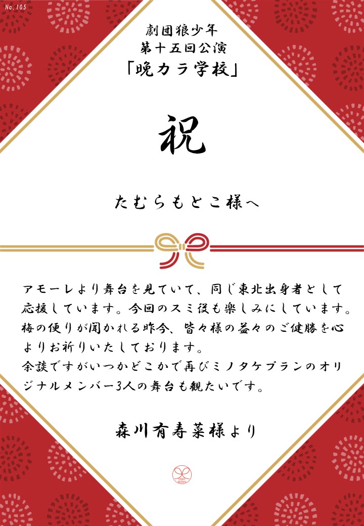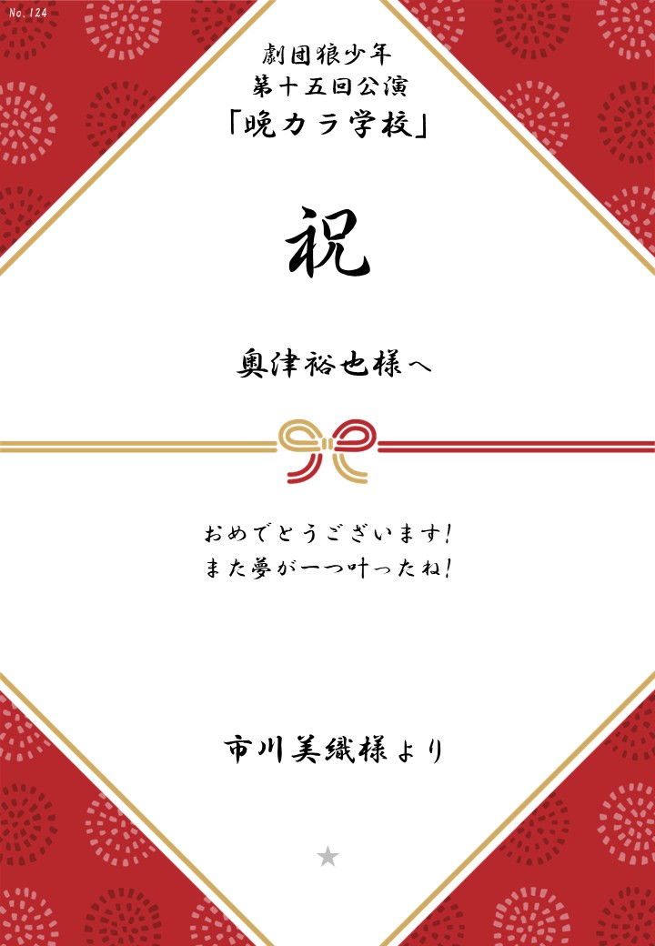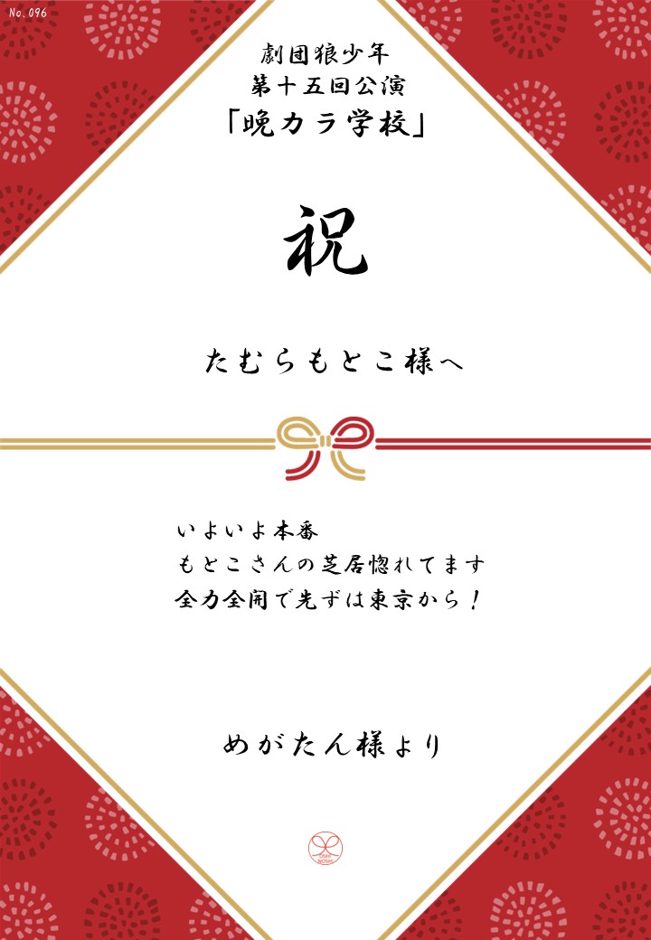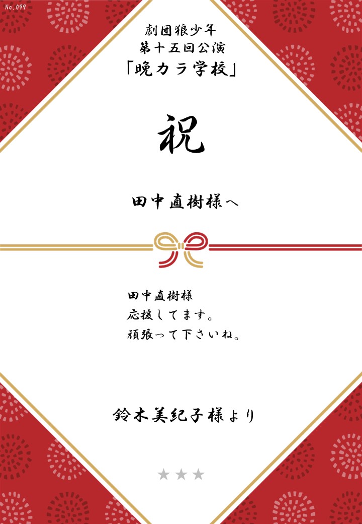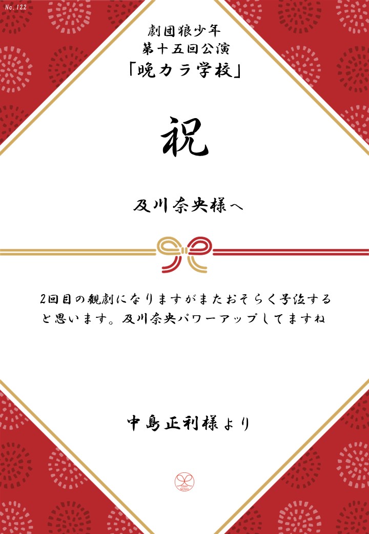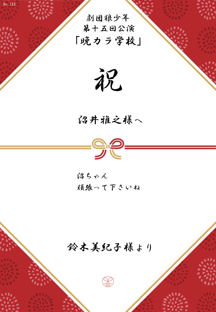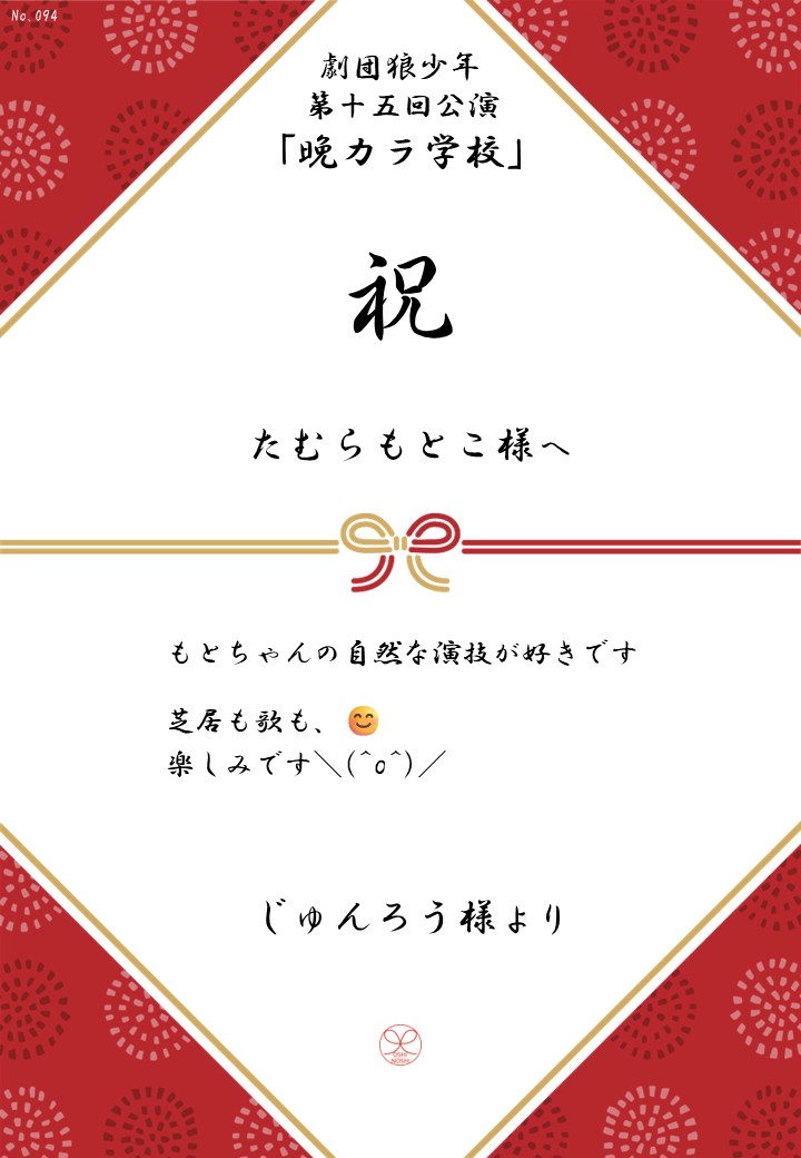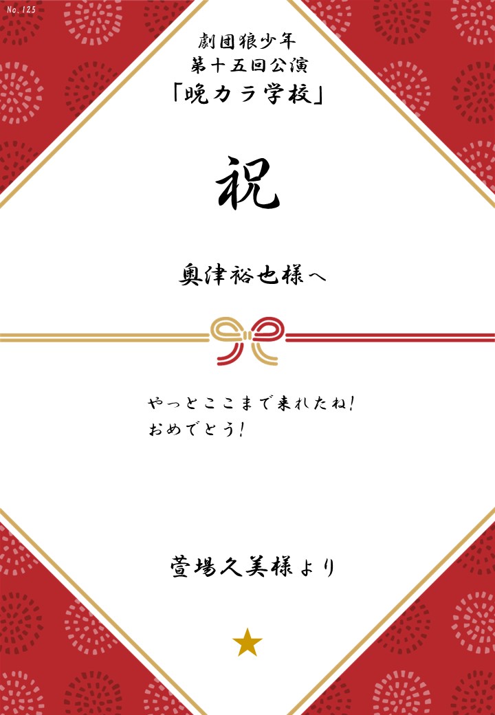 劇団狼少年 第十五回公演「晩カラ学校」応援のしギャラリー 投稿日 2026年1月23日 更新日 2026年2月23日 著者 OSHINOSHI ギャラリーカテゴリ 公演応援のしギャラリー 劇団狼少年 第十五回公演「晩カラ学校」の応援のしを掲示します。 応援のし一覧