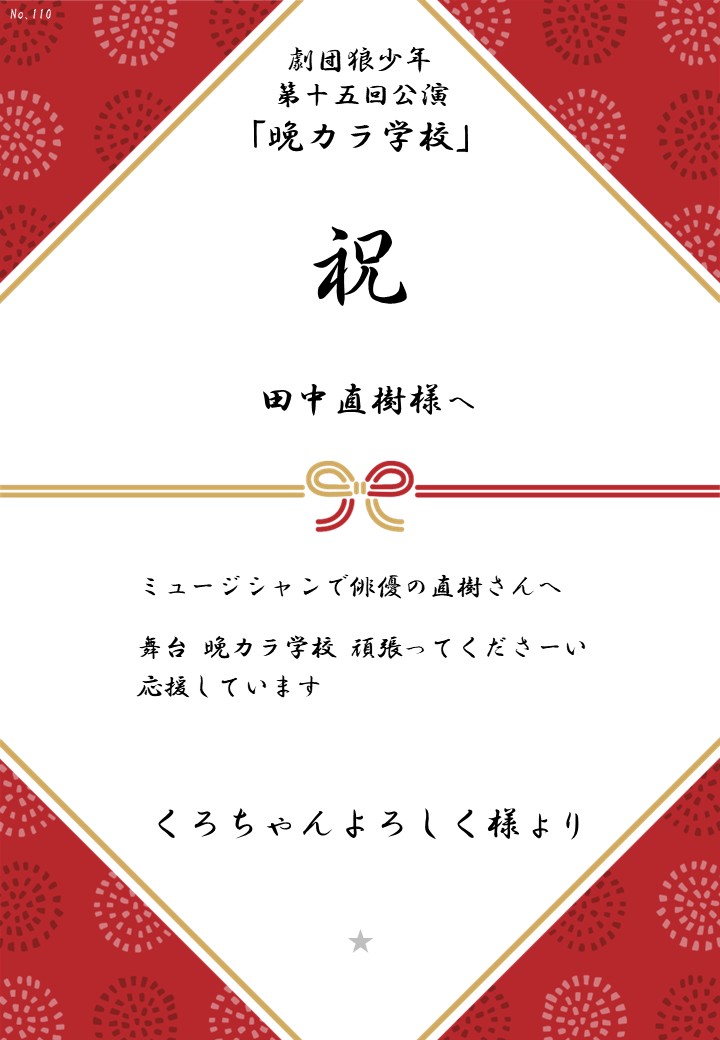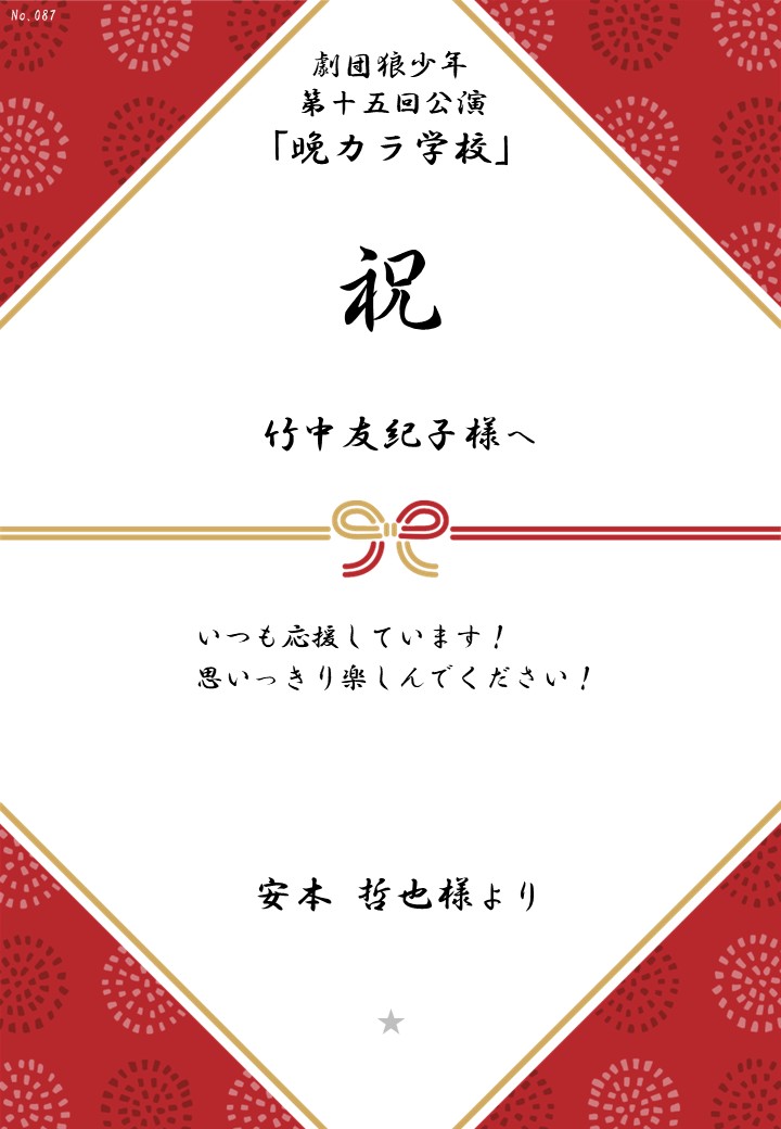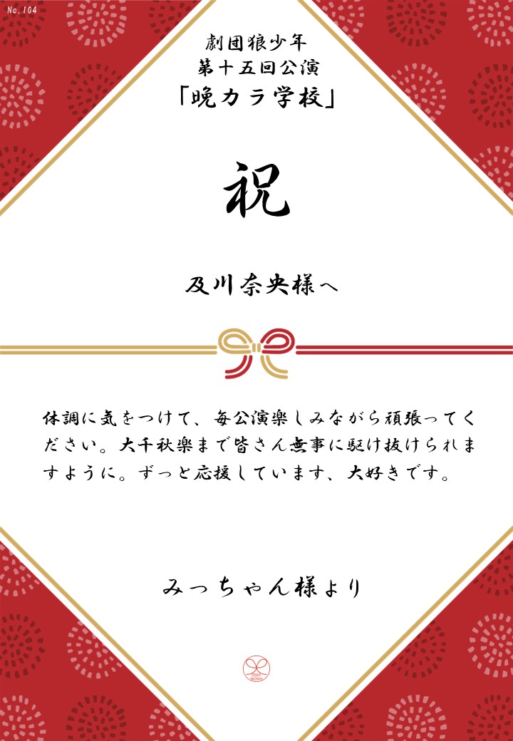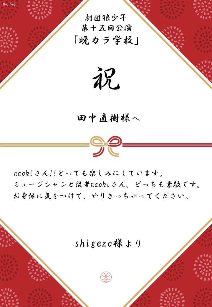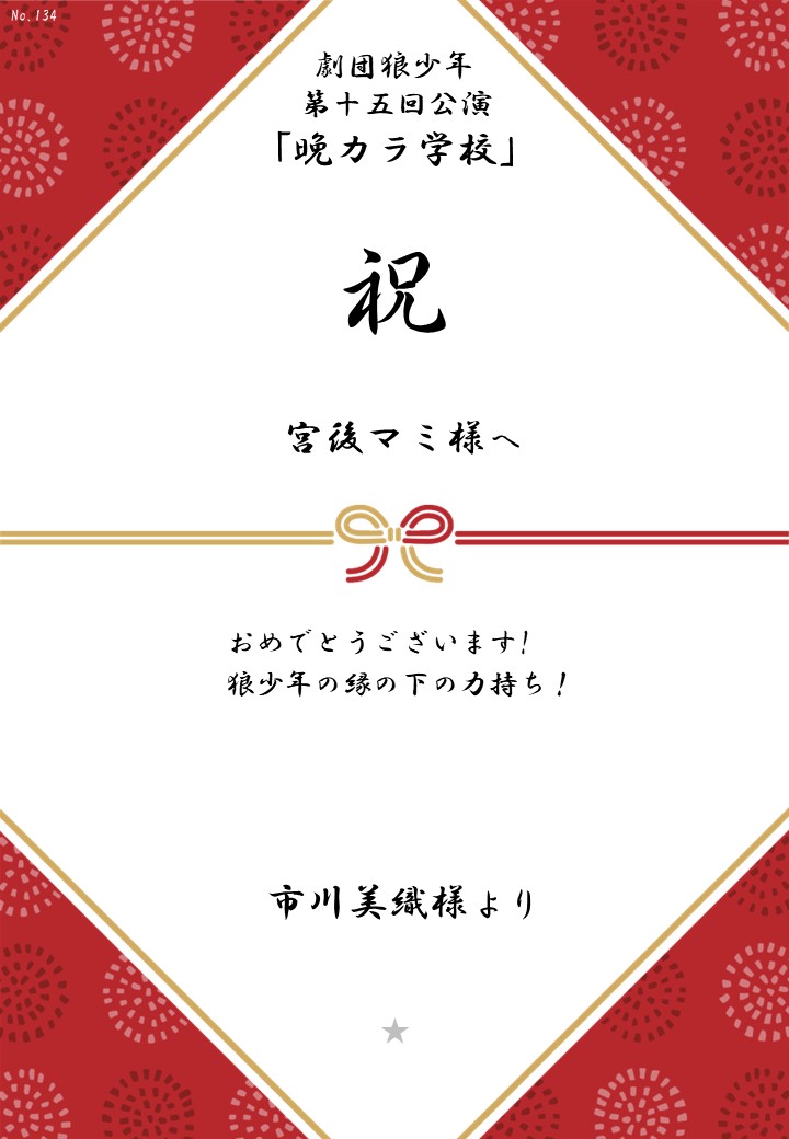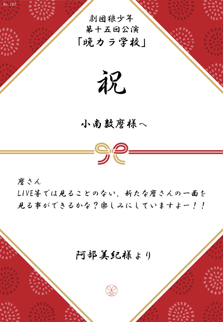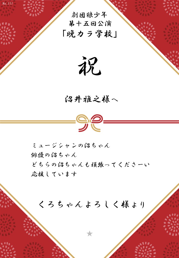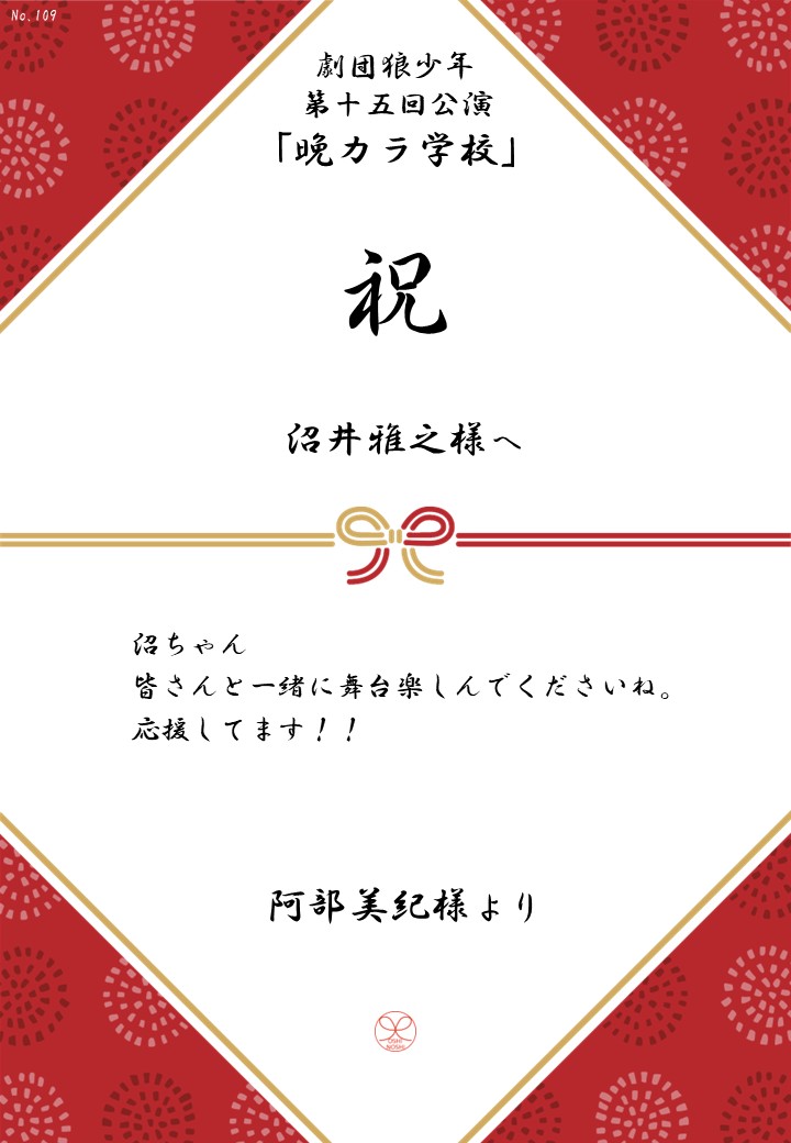 劇団狼少年 第十五回公演「晩カラ学校」応援のしギャラリー 投稿日 2026年1月23日 更新日 2026年2月23日 著者 OSHINOSHI ギャラリーカテゴリ 公演応援のしギャラリー 劇団狼少年 第十五回公演「晩カラ学校」の応援のしを掲示します。 応援のし一覧