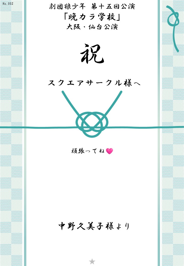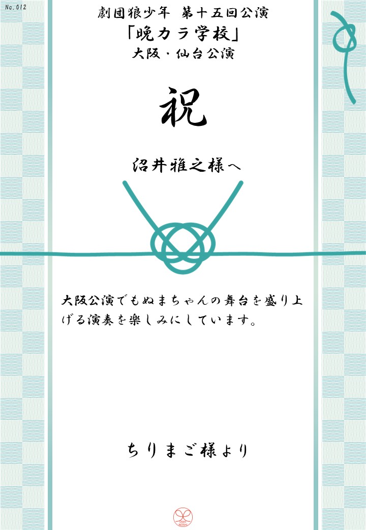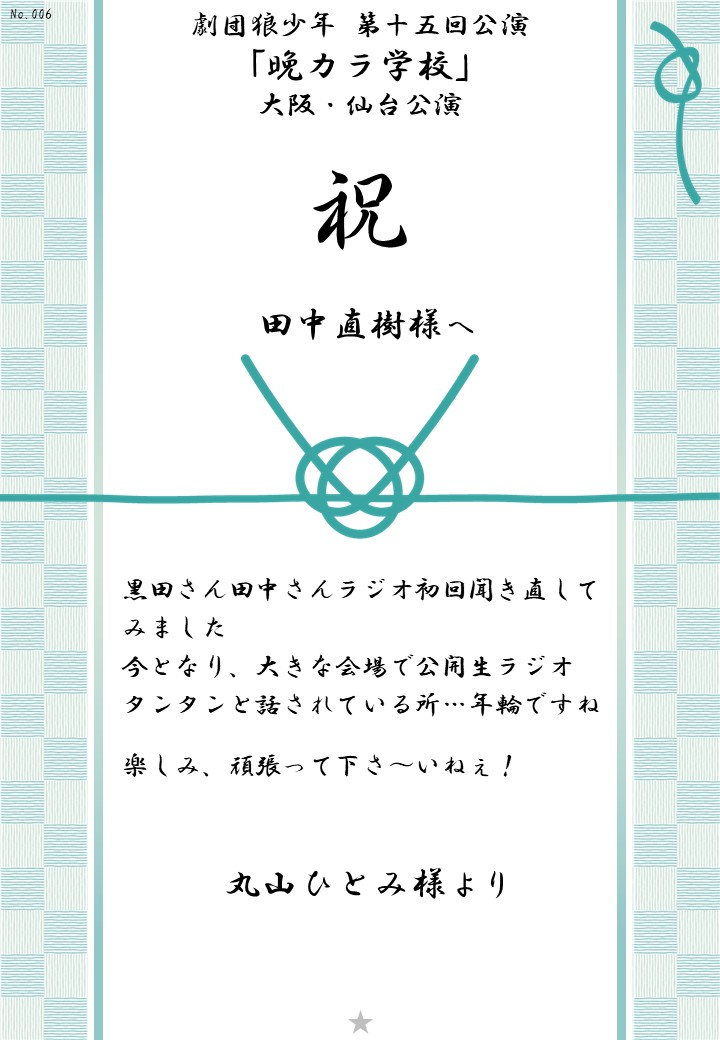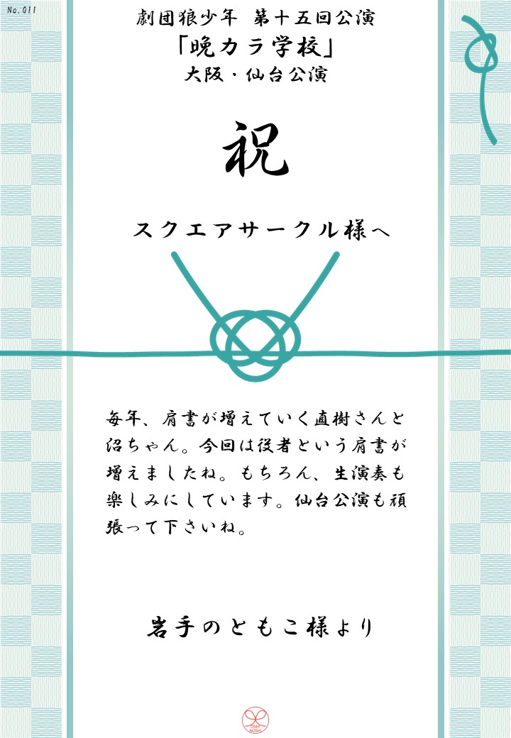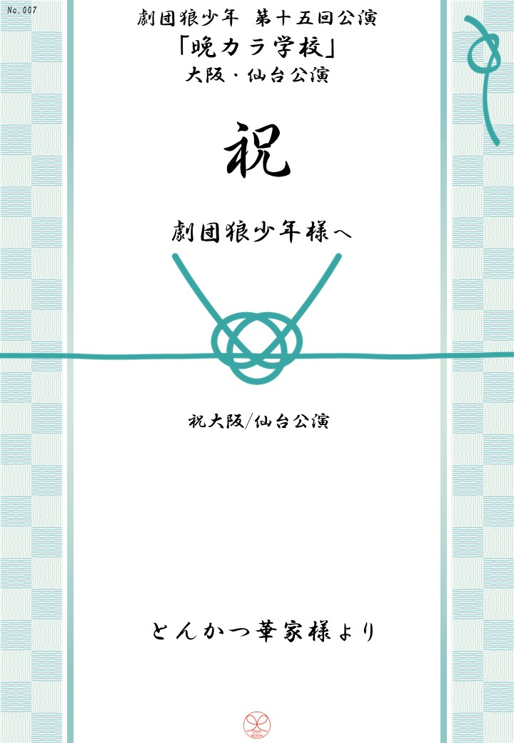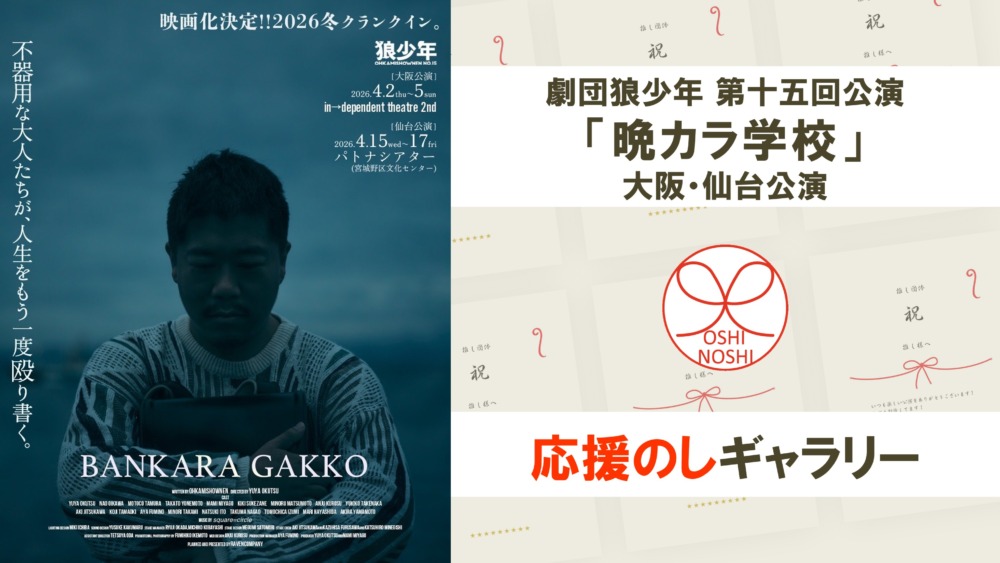 劇団狼少年 第十五回公演「晩カラ学校」大阪・仙台公演 応援のしギャラリー 投稿日 2026年3月11日 更新日 2026年3月13日 著者 OSHINOSHI ギャラリーカテゴリ 公演応援のしギャラリー 劇団狼少年 第十五回公演「晩カラ学校」大阪・仙台公演の応援のしを掲示します。 応援のし申込み 公演詳細情報 応援のし一覧 応援のし募集中です。 \ 応援よろしくお願いします /応援のしを申込む