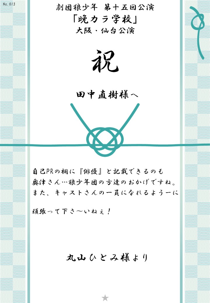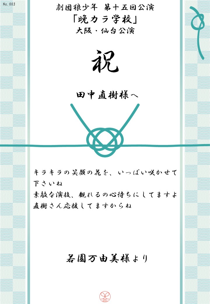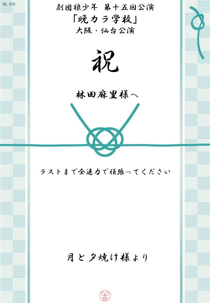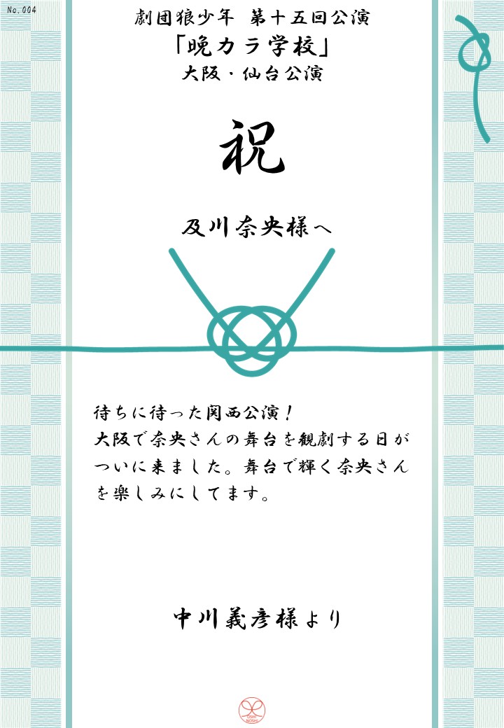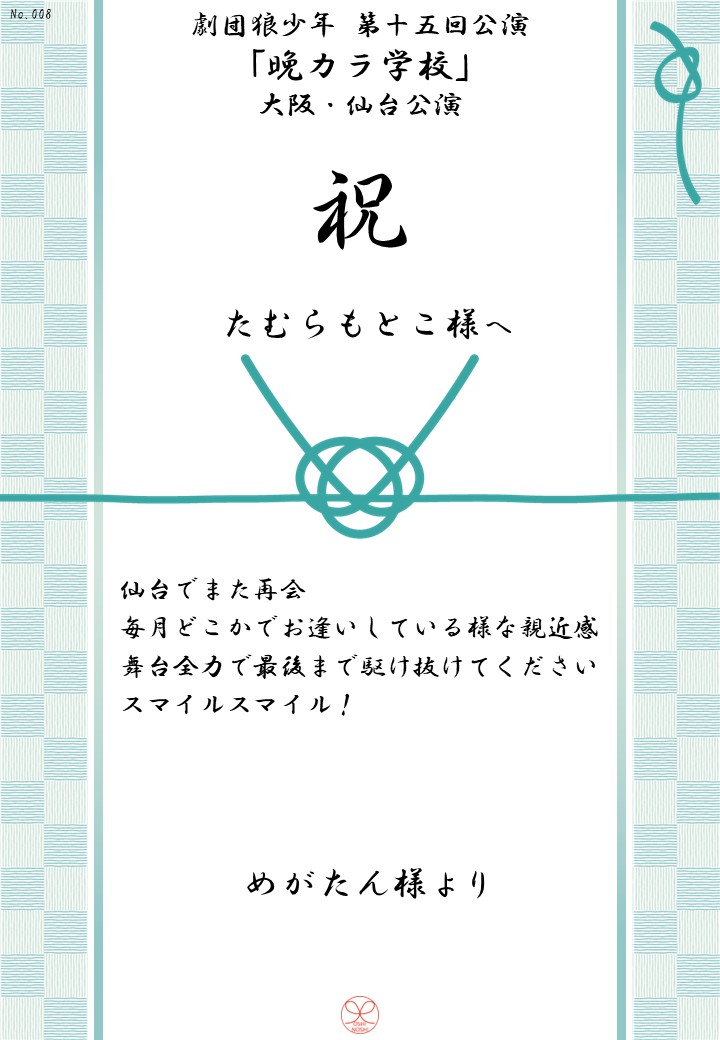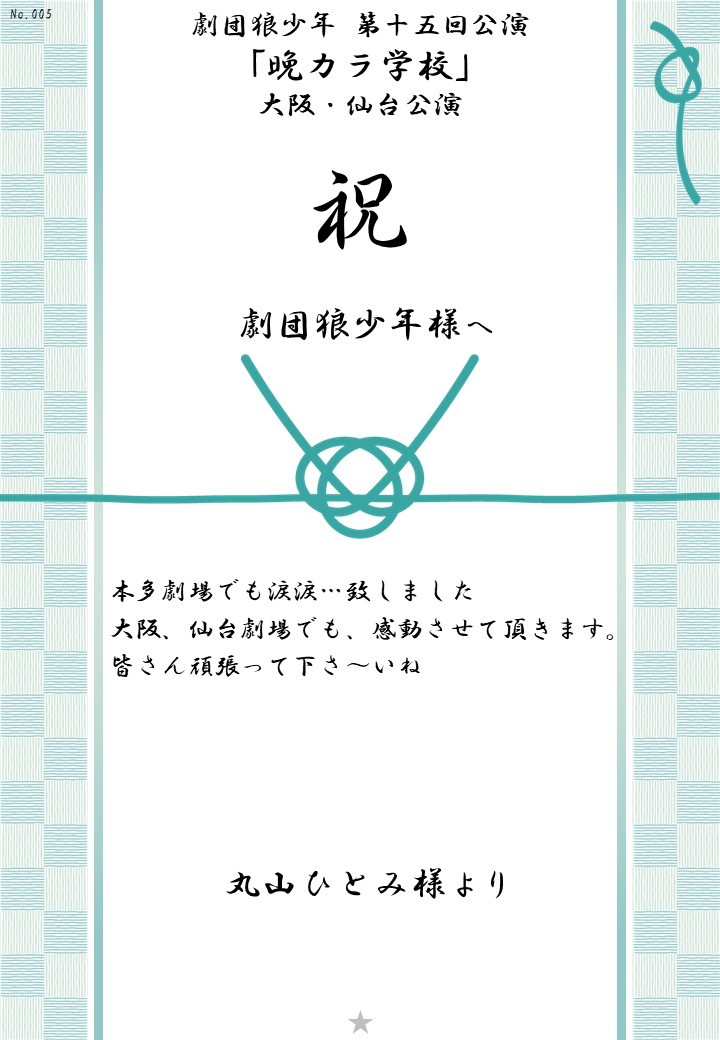 劇団狼少年 第十五回公演「晩カラ学校」大阪・仙台公演 応援のしギャラリー 投稿日 2026年3月11日 更新日 2026年3月13日 著者 OSHINOSHI ギャラリーカテゴリ 公演応援のしギャラリー 劇団狼少年 第十五回公演「晩カラ学校」大阪・仙台公演の応援のしを掲示します。 応援のし申込み 公演詳細情報 応援のし一覧 応援のし募集中です。 \ 応援よろしくお願いします /応援のしを申込む