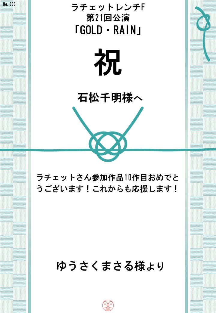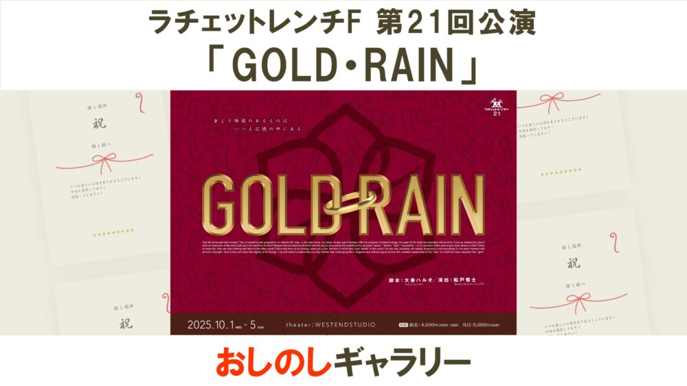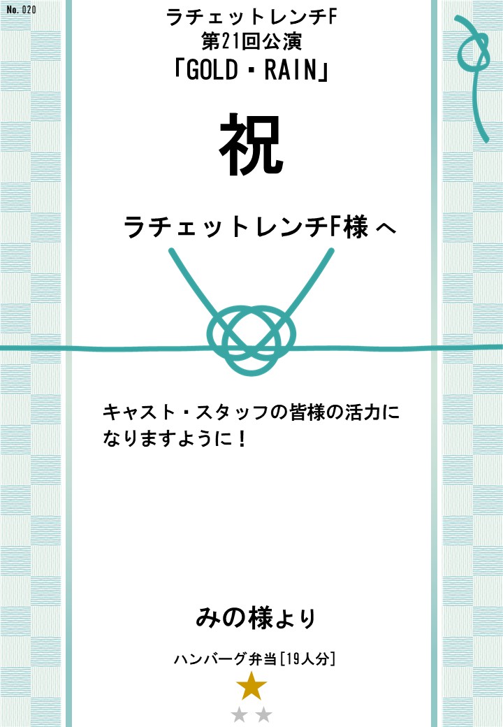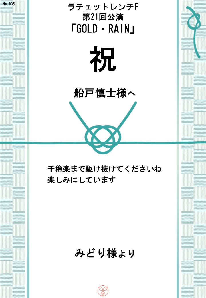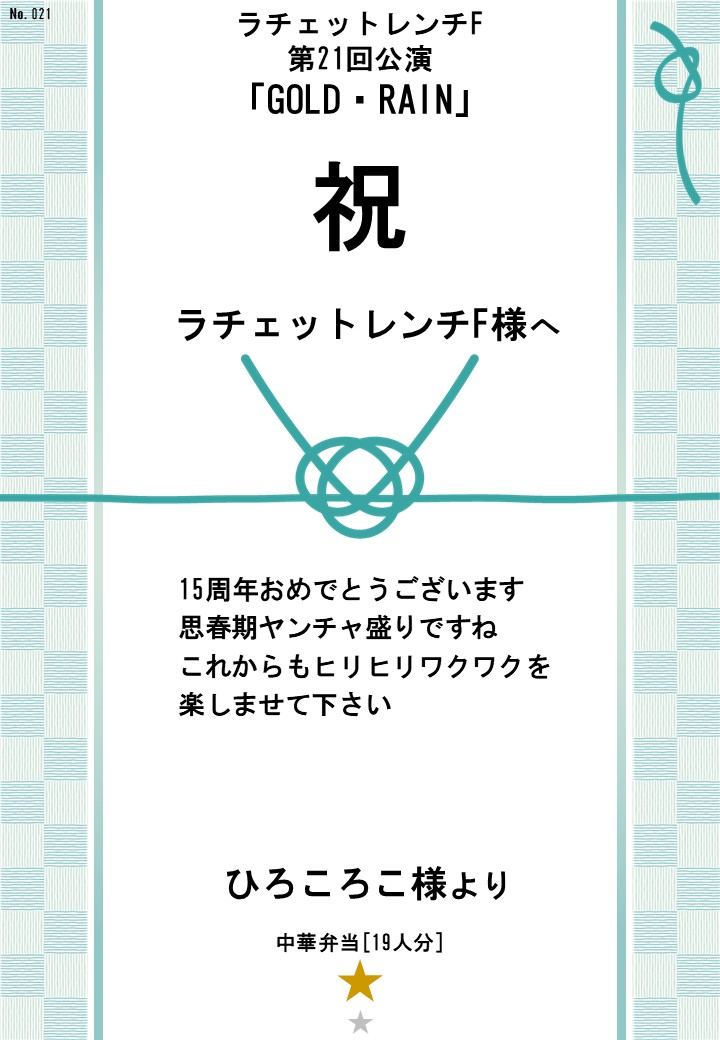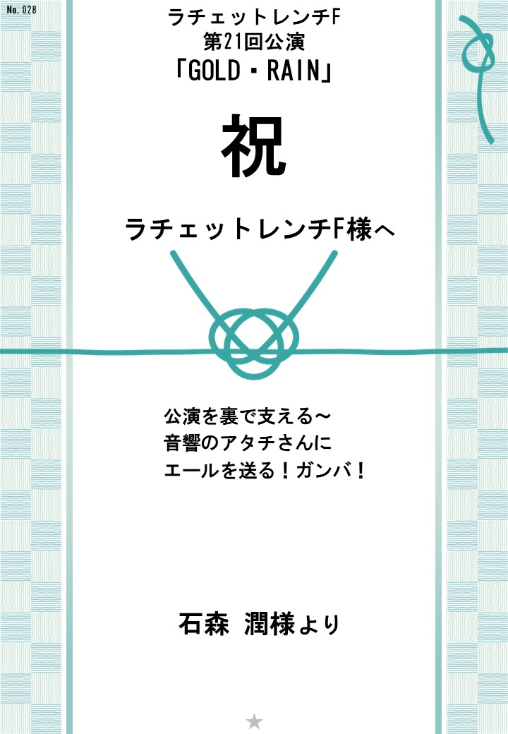 ラチェットレンチF 第21回公演「GOLD・RAIN」の応援のし&差入れを掲示します。