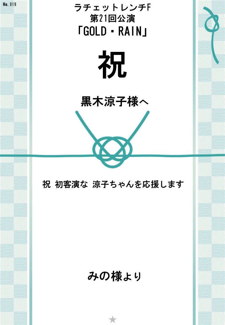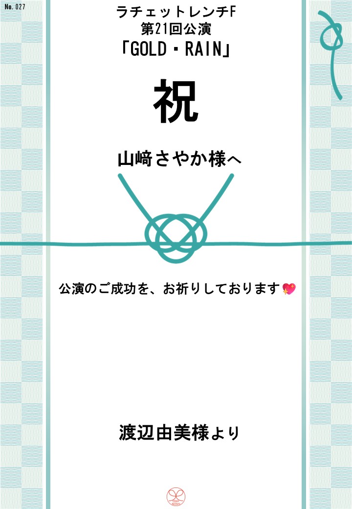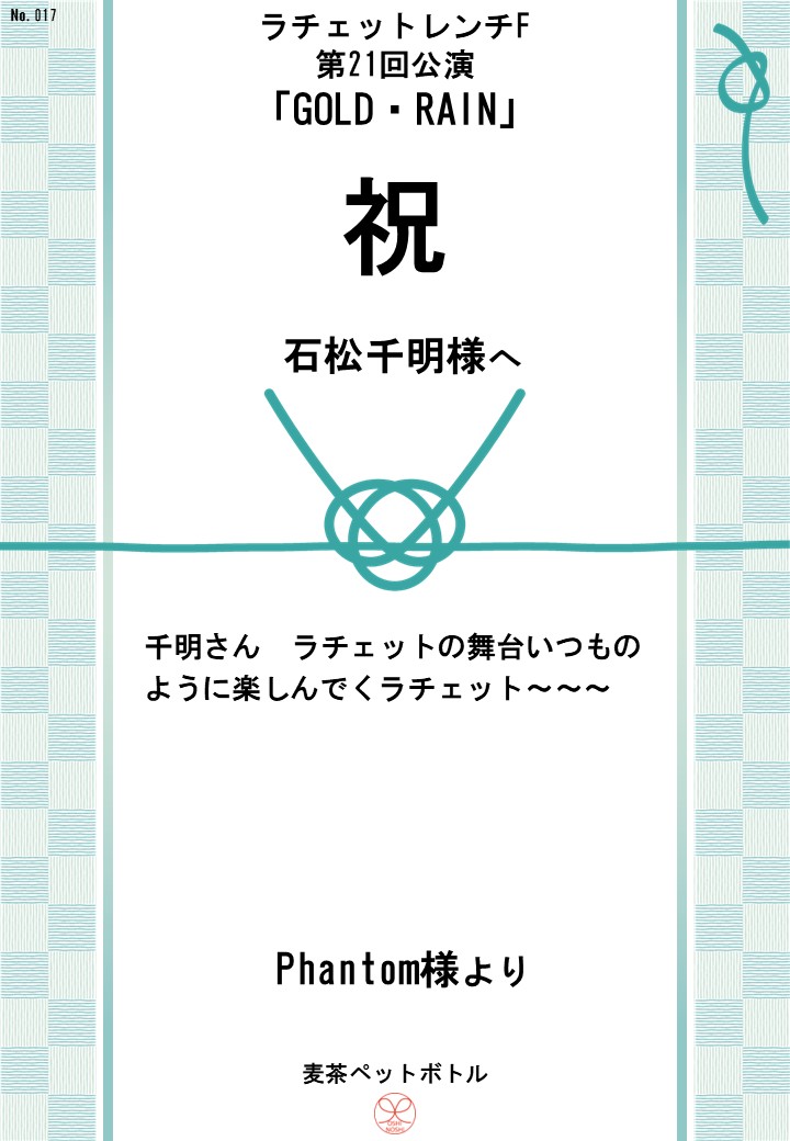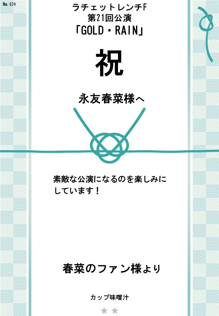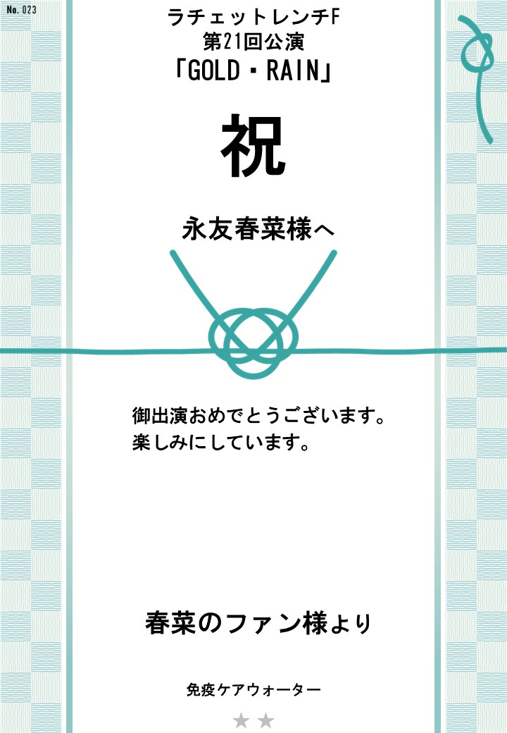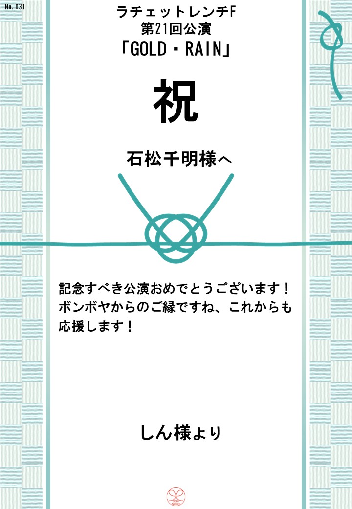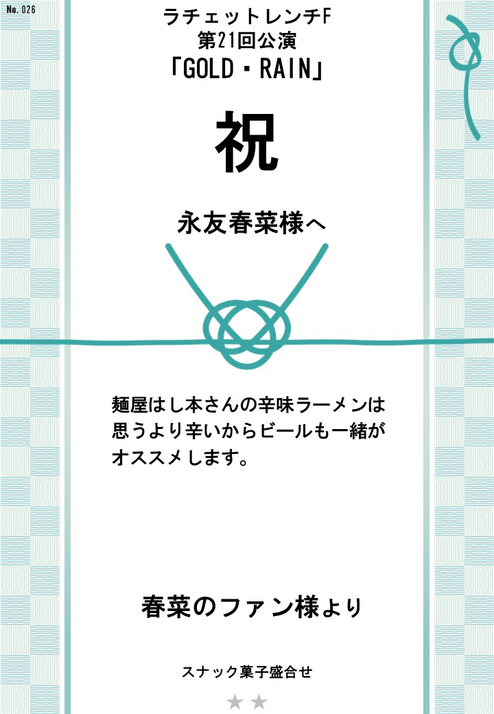 ラチェットレンチF 第21回公演「GOLD・RAIN」の応援のし&差入れを掲示します。