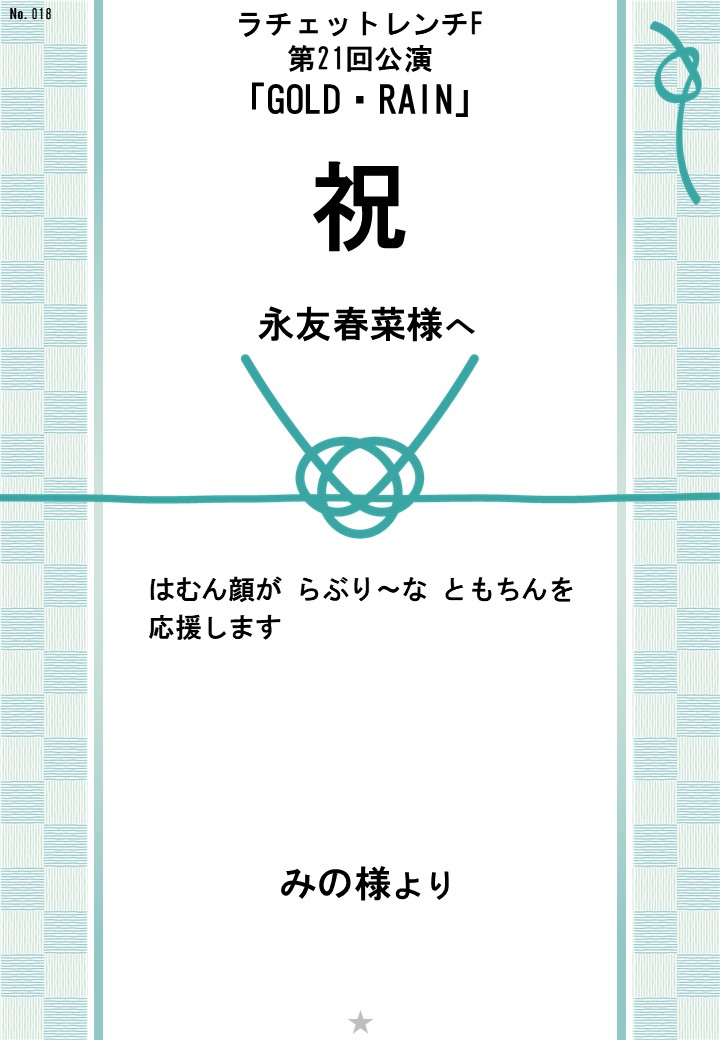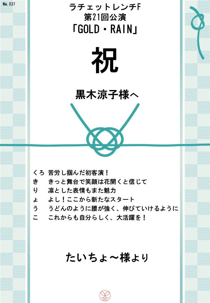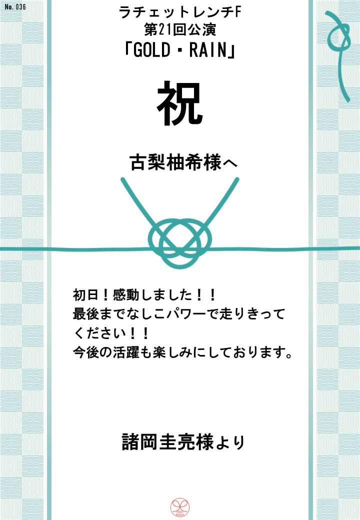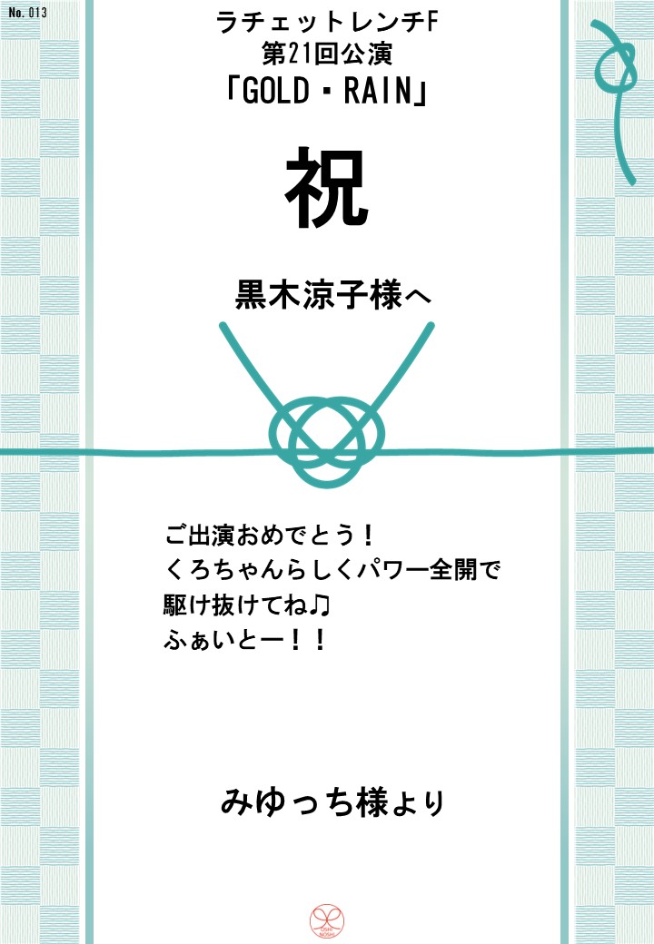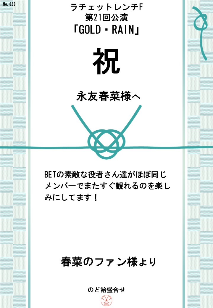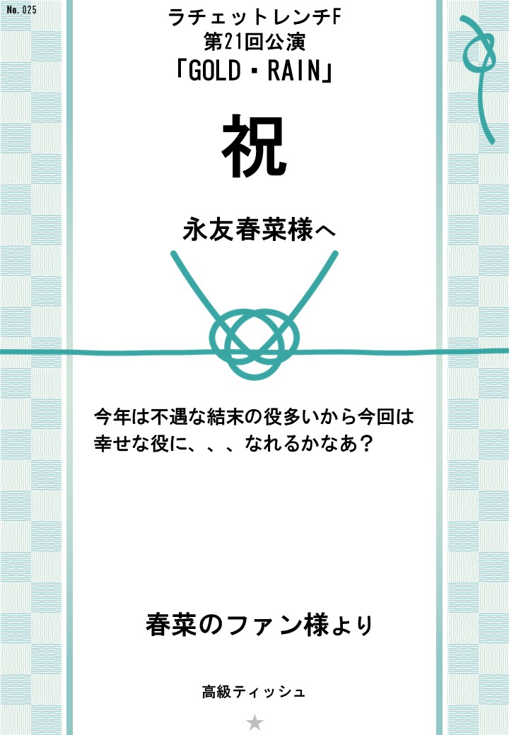 ラチェットレンチF 第21回公演「GOLD・RAIN」の応援のし&差入れを掲示します。