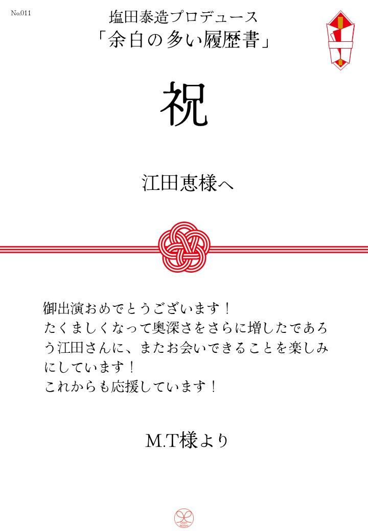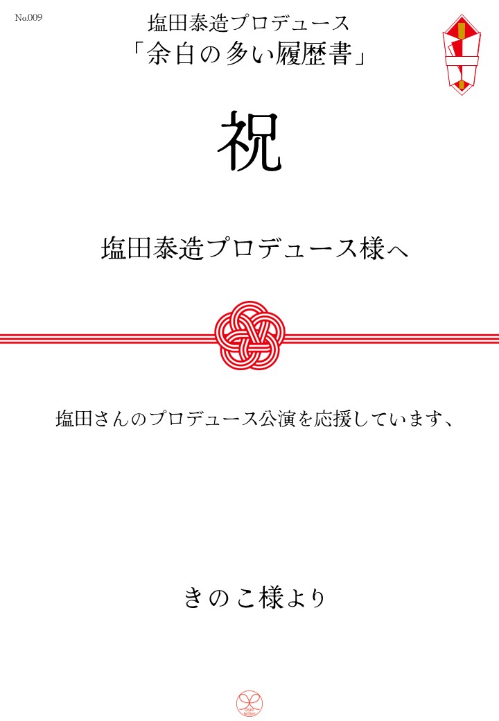塩田泰造プロデュース「余白の多い履歴書」応援のしギャラリー 投稿日 2025年11月19日 更新日 2025年12月21日 著者 OSHINOSHI ギャラリーカテゴリ 公演応援のしギャラリー 塩田泰造プロデュース「余白の多い履歴書」の応援のしを掲示します。 応援のし一覧 応援のし募集中です。