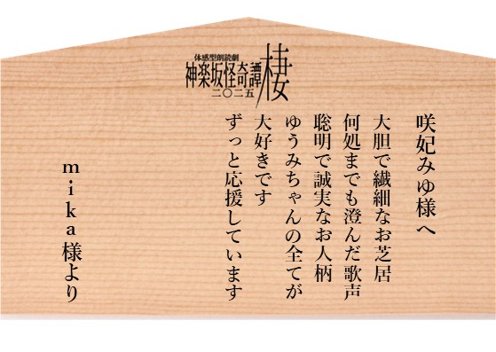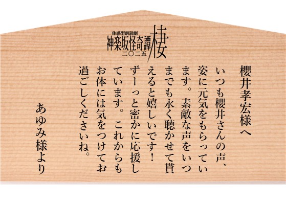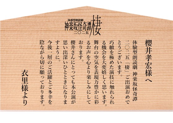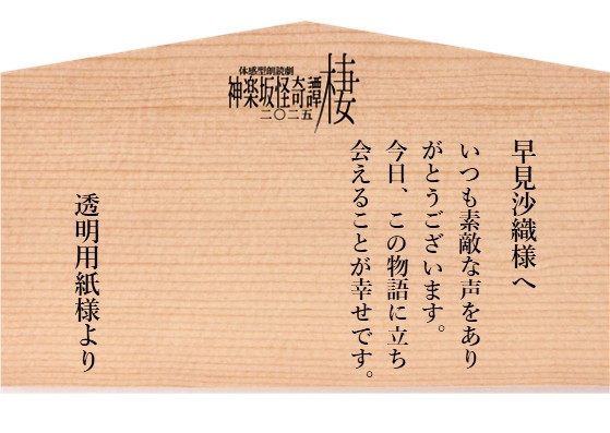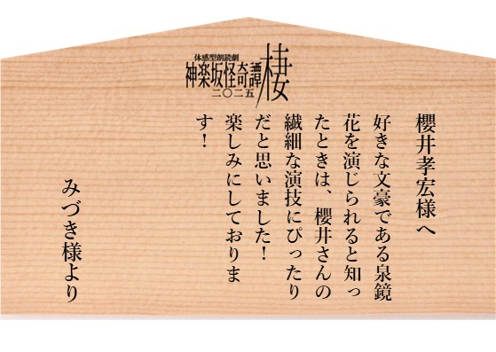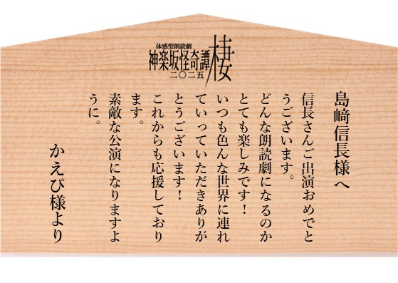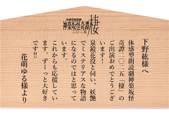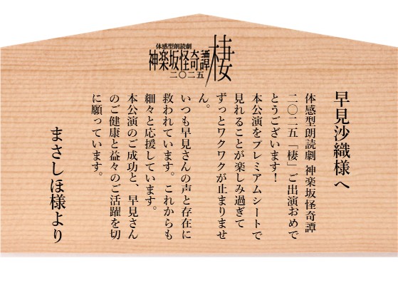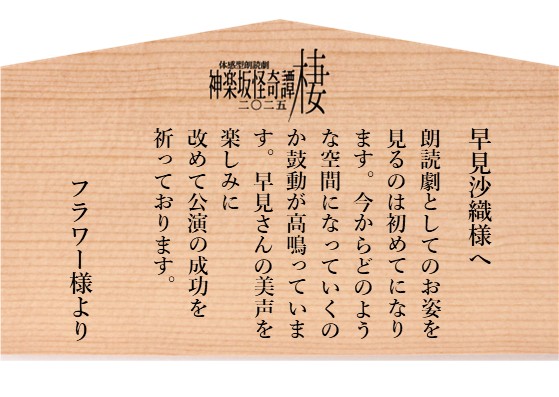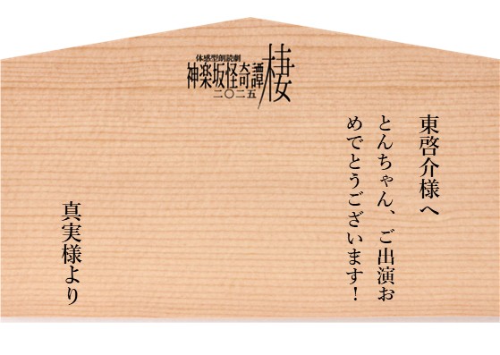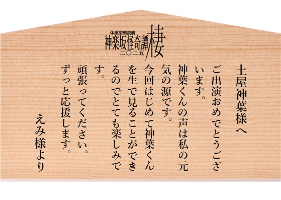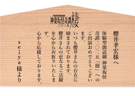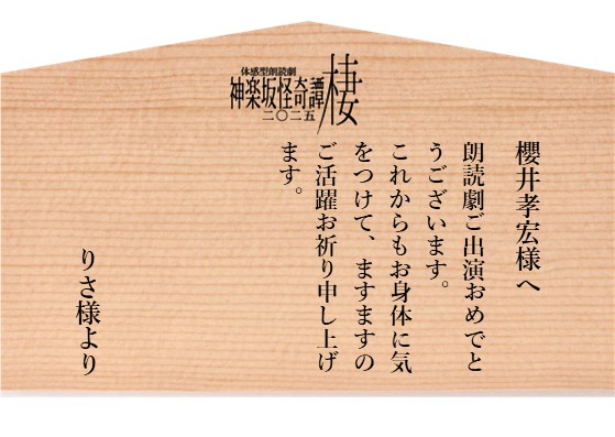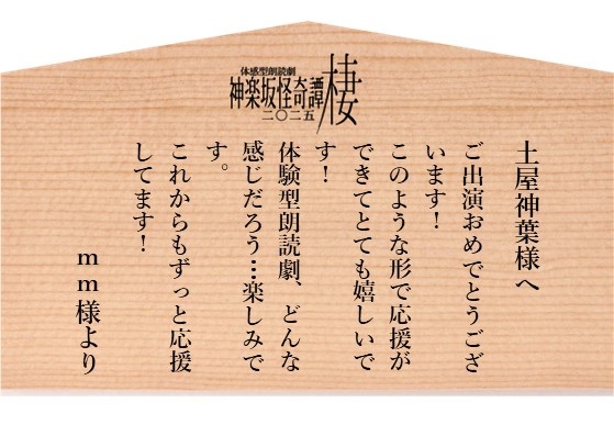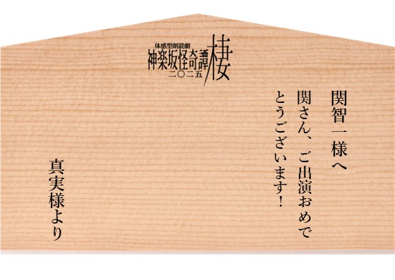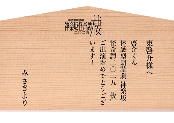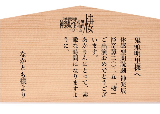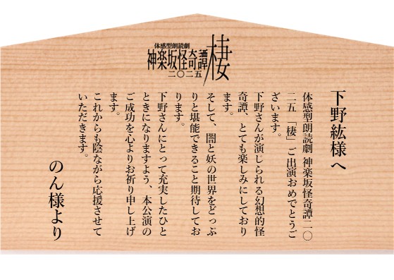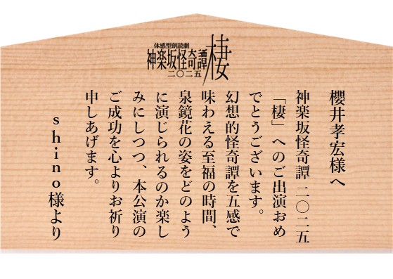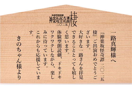 体感型朗読劇 神楽坂怪奇譚二〇二五「棲」応援絵馬ギャラリー 投稿日 2025年11月6日 更新日 2025年11月9日 著者 OSHINOSHI ギャラリーカテゴリ 公演応援のしギャラリー 体感型朗読劇 神楽坂怪奇譚二〇二五「棲」の応援絵馬を掲示します。 応援絵馬申込み 公演詳細情報 応援絵馬一覧 応援絵馬募集中です。 \ 応援よろしくお願いします /応援絵馬を申込む