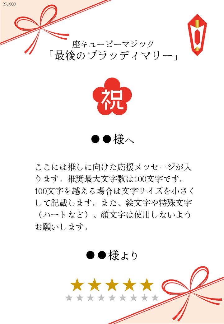 座キューピーマジック「最後のブラッディマリー」の応援のしです。劇団や出演者に応援メッセージを贈れます。