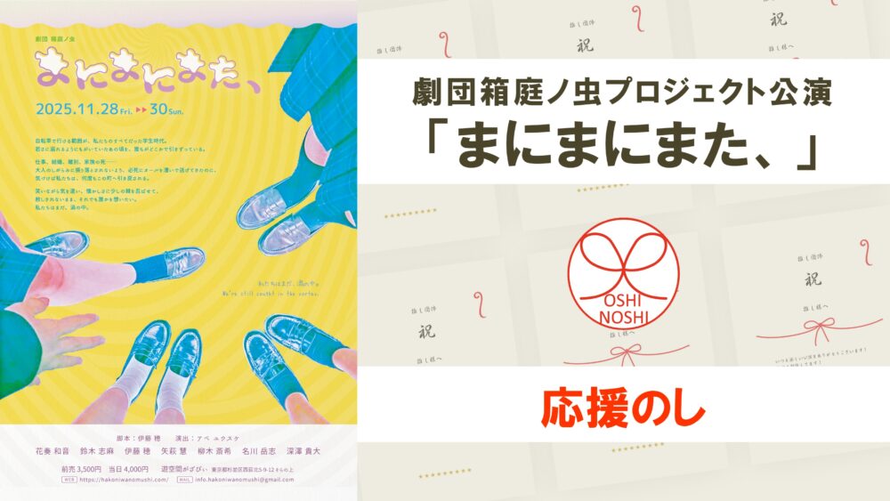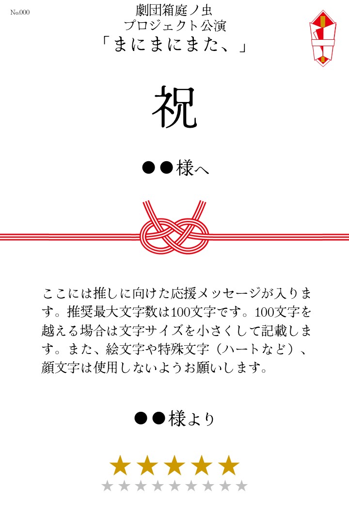 劇団箱庭ノ虫劇団箱庭ノ虫プロジェクト公演「まにまにまた、」の応援のしです。劇団や出演者に応援メッセージを贈れます。