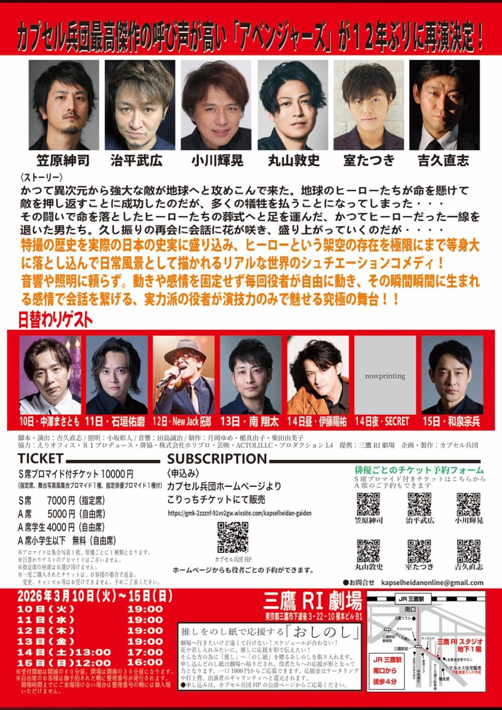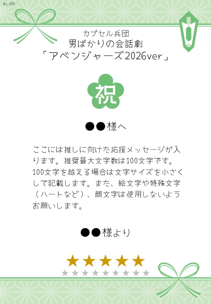 カプセル兵団男ばかりの会話劇「アベンジャーズ2026ver」の応援のしです。劇団や出演者に応援メッセージを贈れます。