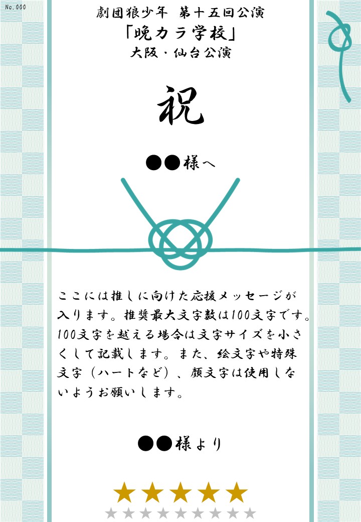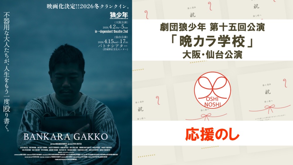 劇団狼少年 第十五回公演「晩カラ学校」大阪・仙台公演の応援のしです。劇団や出演者に応援メッセージを贈れます。