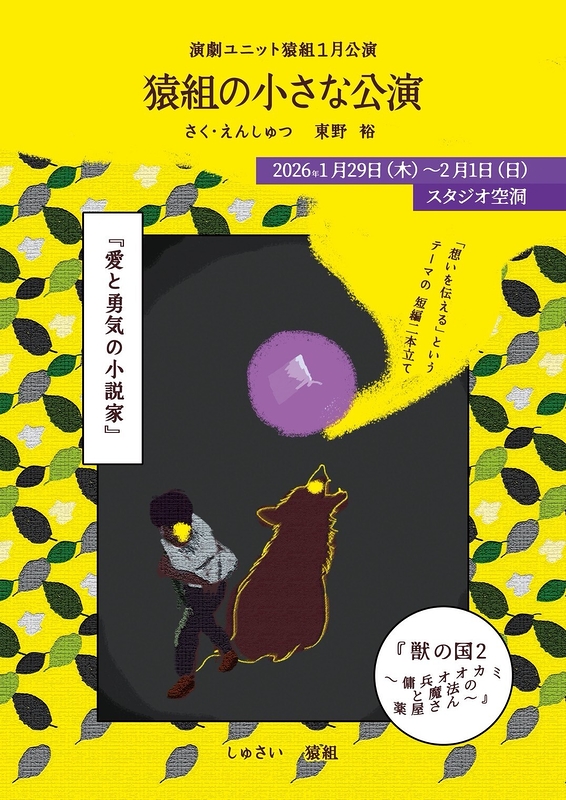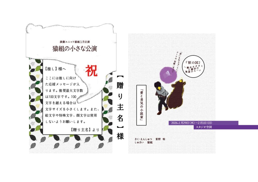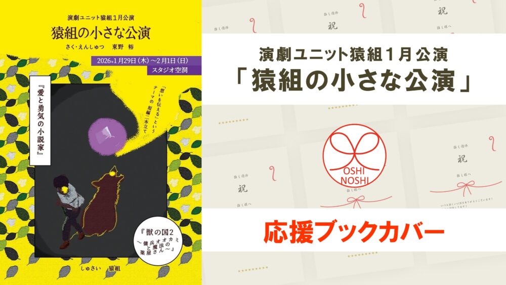 猿組演劇ユニット猿組1月公演「猿組の小さな公演」の応援ブックカバーです。劇団や出演者に応援メッセージを贈れます。